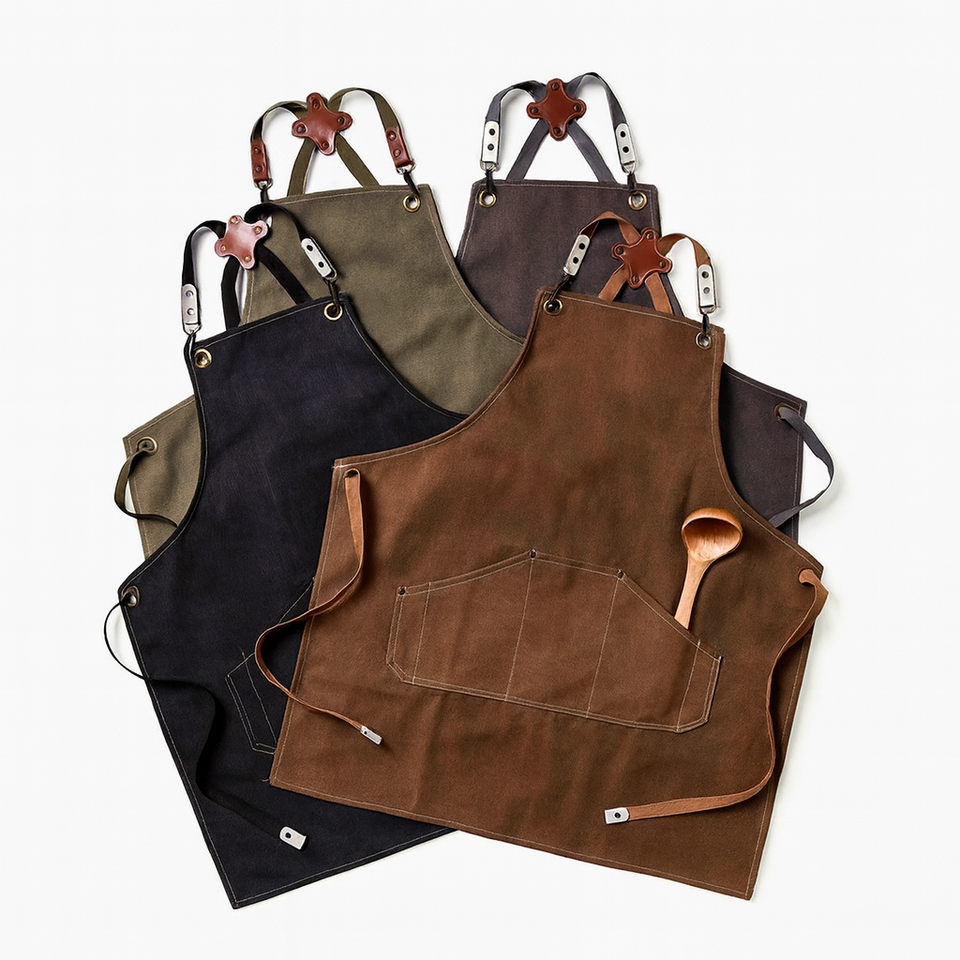 ผ้ากันเปื้อนหนังผสมผ้าแคนวาสแบบปรับได้สุดหรู อุปกรณ์ครัวสำหรับเชฟ ผ้ากันเปื้อนทำอาหารแบบซักได้ มีกระเป๋า สามารถสั่งทำได้