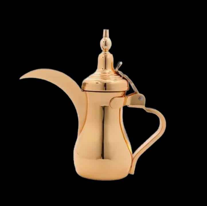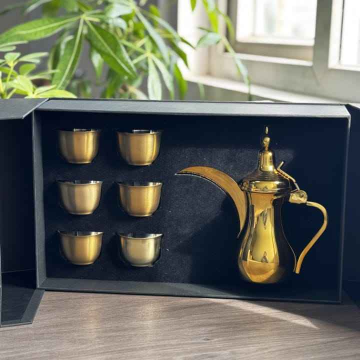 กาต้มกาแฟดัลลาห์ทองคำหรูหราสไตล์อาหรับ ทำจากสแตนเลส พร้อมถาดแก้วสวยงามและถ้วยฟินจัน สำหรับตกแต่งห้องรับแขกสมัยใหม่