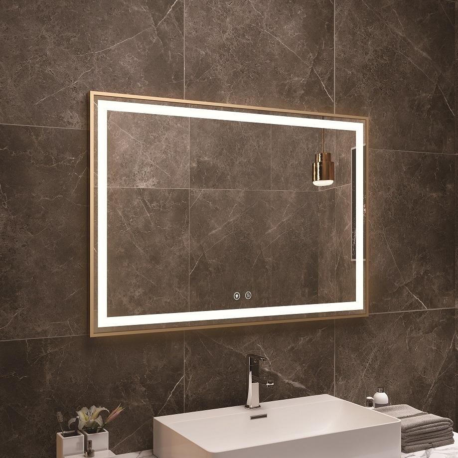 กระจกโต๊ะเครื่องแป้งกรอบสีทองโค้งสุดหรูพร้อมหน้าจอ LED หน้าจอเวลาอัจฉริยะป้องกันหมอกและหรี่แสงได้