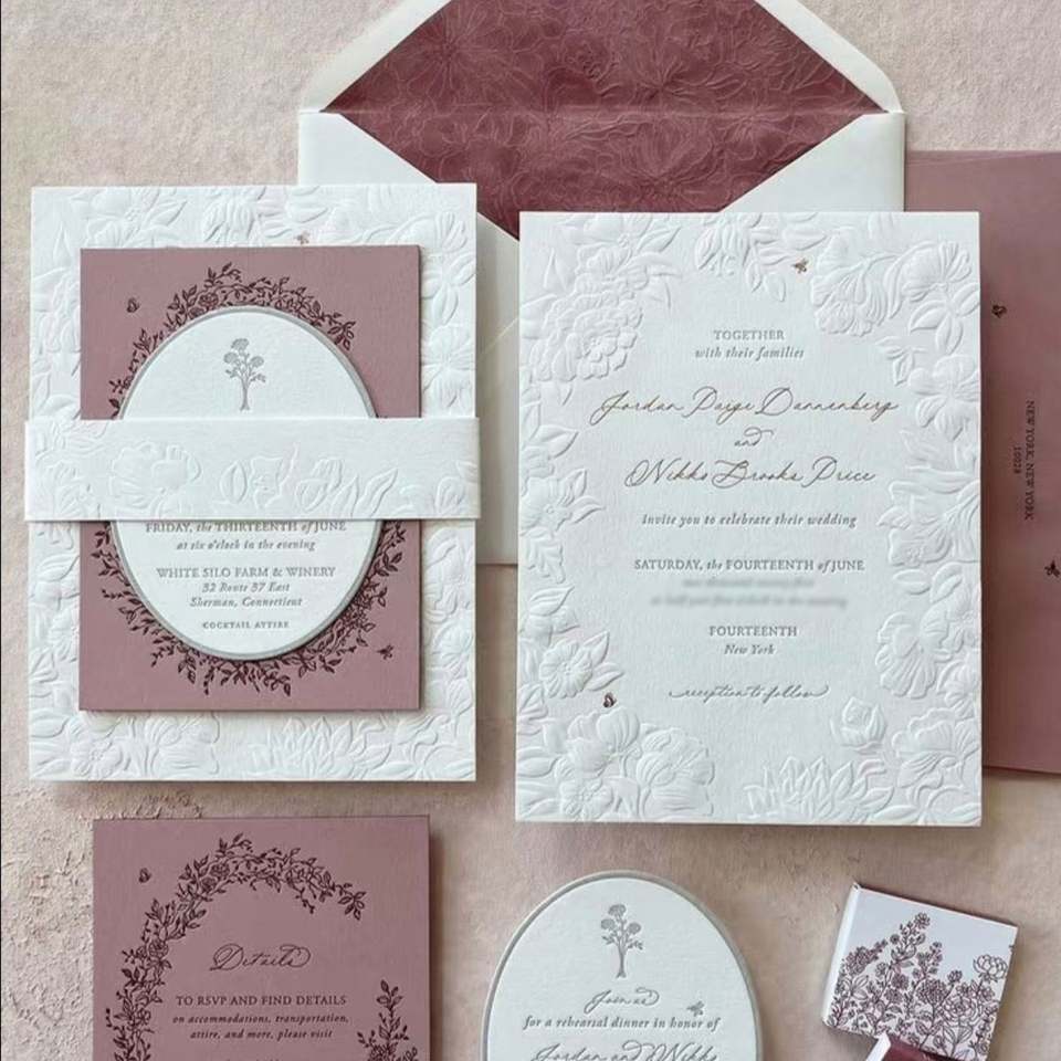 การ์ดเชิญงานแต่งงานกระดาษอาร์ตและกระดาษแข็งสุดหรู พร้อมพิมพ์แบบ Letterpress ชุดโมโนแกรมสั่งทำพิเศษสำหรับผู้จัดงานแต่งงาน