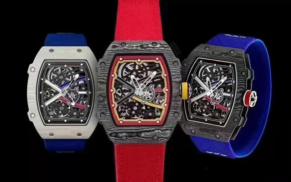 นาฬิกาข้อมืออัตโนมัติสุดหรู ระบบสองเขตเวลา หน้าปัดเรืองแสงลายอุกกาบาต ขอบหน้าปัดสีแดงน้ำเงิน สายหนัง/ยาง ตัวล็อคแบบซ่อน