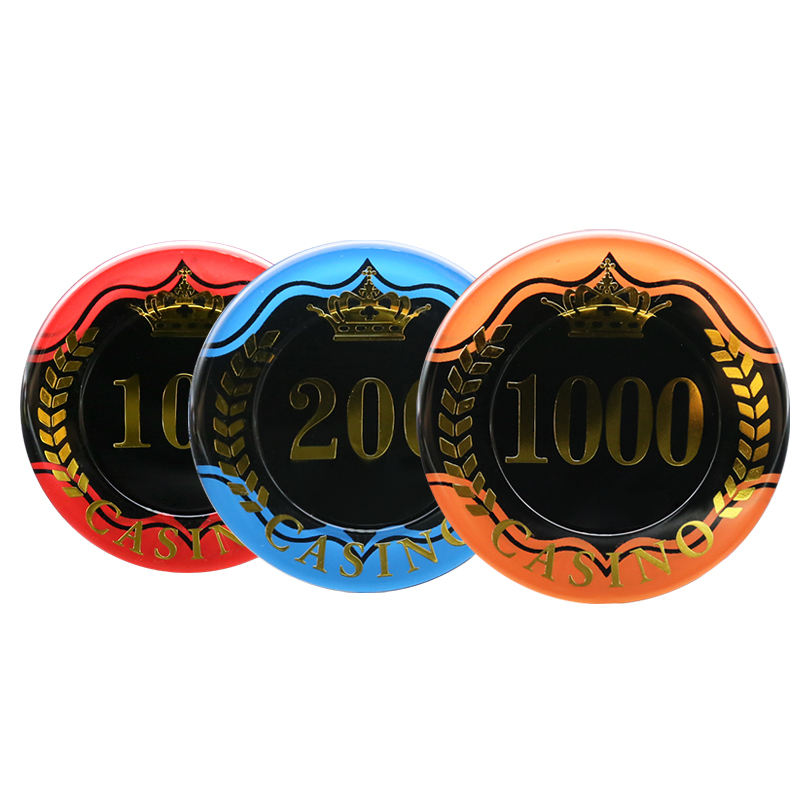 ชิปคริสตัลบัคคาราหรูหรา เทคโนโลยีป้องกันการปลอมแปลง RFID ดีไซน์อะคริลิกแบบกำหนดเองได้ ลายนูนสีทอง ผลิตโดยคาสิโนมาเก๊า