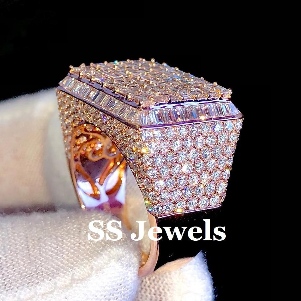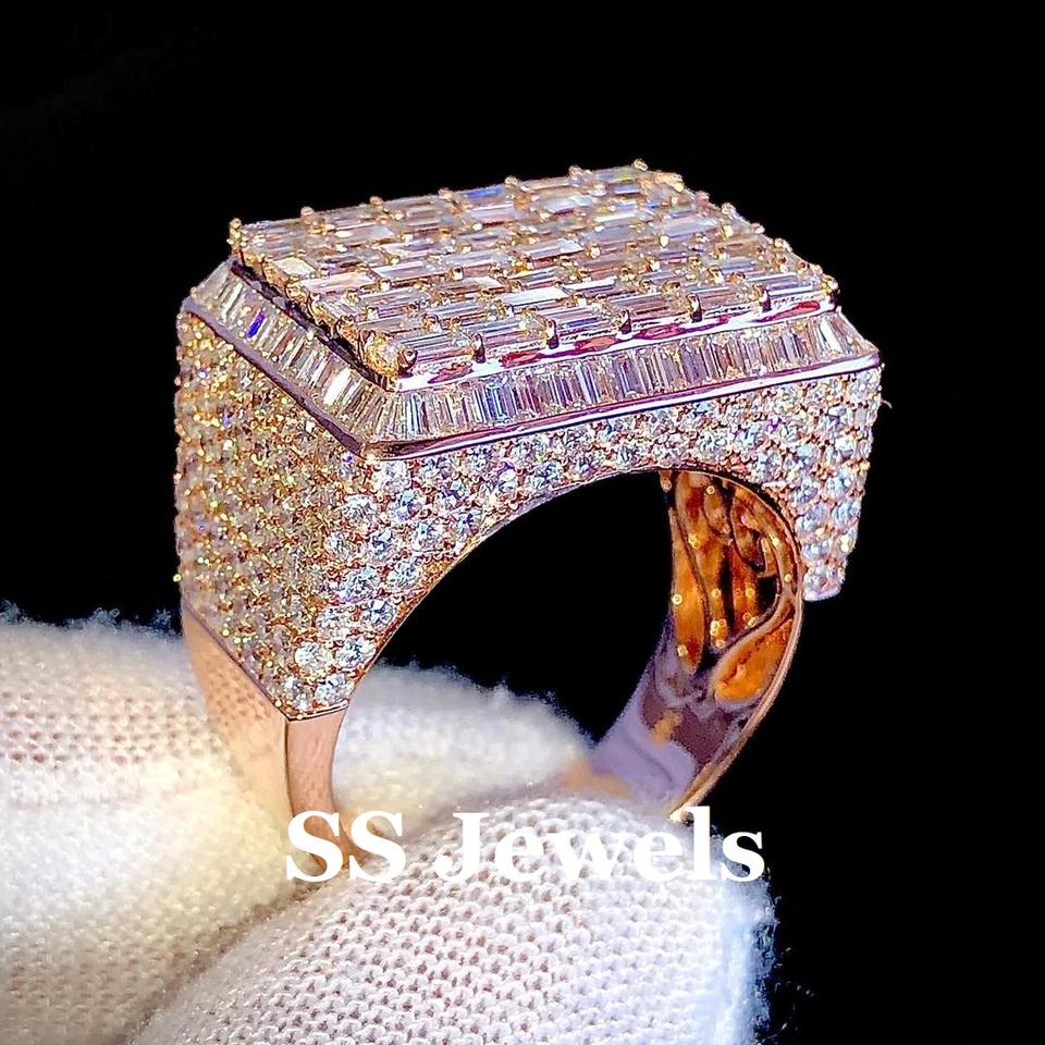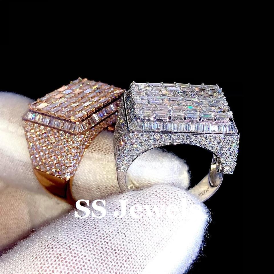 แหวนผู้ชาย Baguette Moissanite สุดหรูประดับด้วยง่ามชุบโรเดียมทรงสี่เหลี่ยมทำจาก925ทันสมัยเครื่องประดับฮิปฮอปสีเงินตามสั่ง