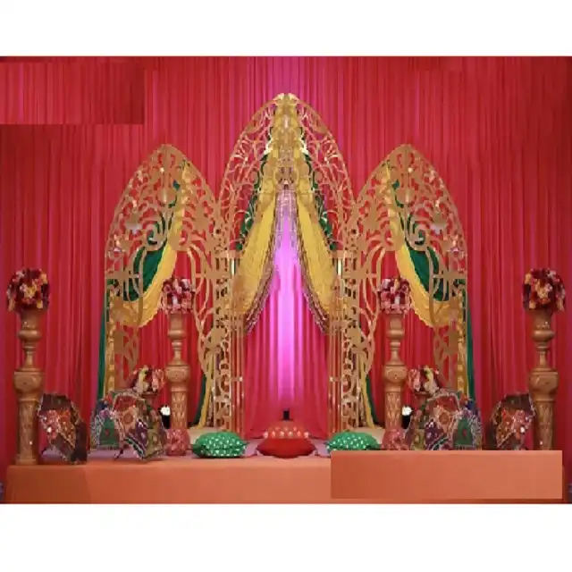 แผงโลหะฉากหลังสำหรับพิธีมอบกำไลข้อมือสุดหรูแผงเลเซอร์คัทสไตล์อินเดียกรอบโลหะแบบเซลส์ยืน