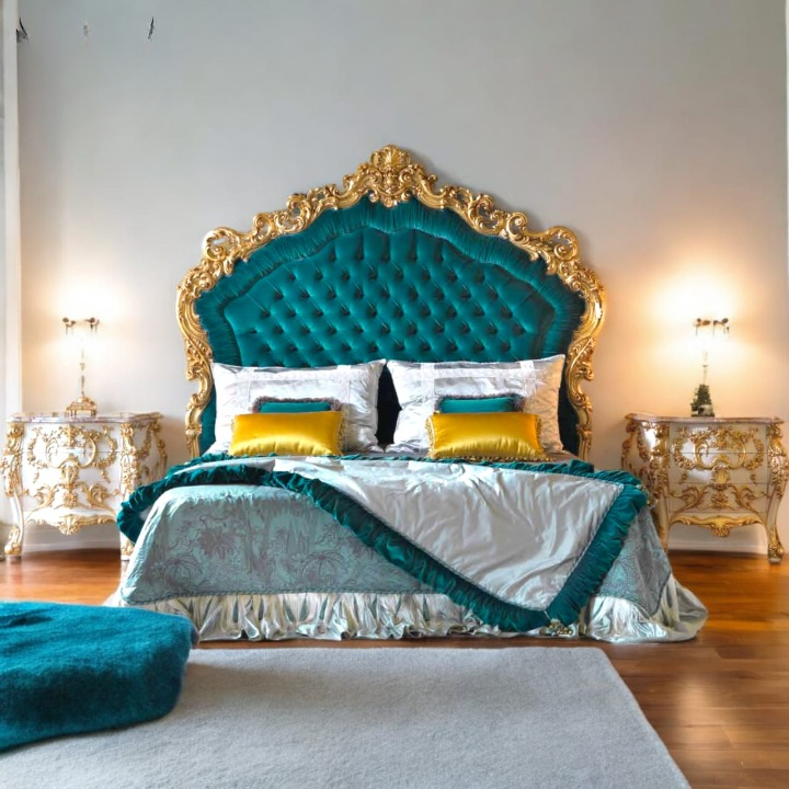 เตียงไม้มะฮอกกานีสไตล์บาโรกสุดหรู พร้อมที่เก็บของ 2 ตัว โต๊ะข้างเตียงหุ้มกำมะหยี่สีเขียวอมฟ้า ลายแกะสลักทองคำ เฟอร์นิเจอร์บ้านสไตล์โมเดิร์น