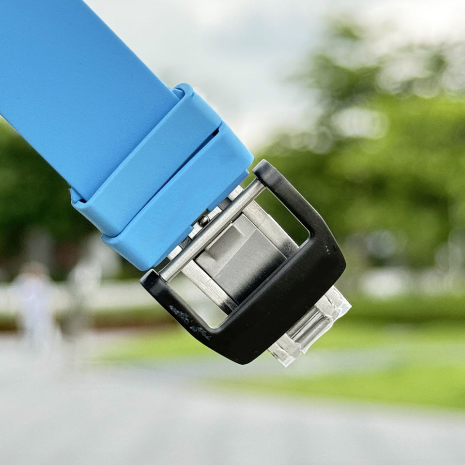 นาฬิกาข้อมือผู้ชายทรงกระบอกหรูหรา ระบบกลไกอัตโนมัติ ดีไซน์ทูร์บิญองคู่ สายยางสีน้ำเงิน