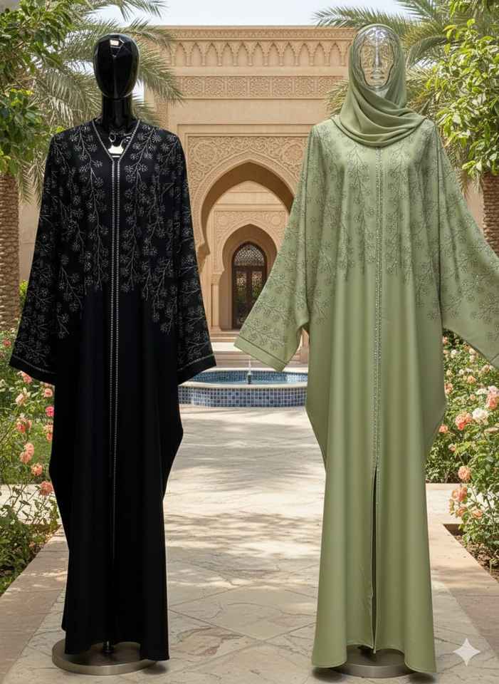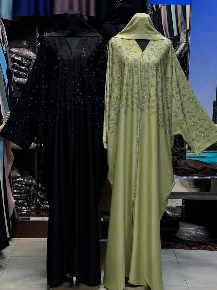ชุดอาบายะแบบคัฟตันทรงปีกค้างคาวสุดหรู - ตกแต่งด้วยเลื่อมปักลายคริสตัลอย่างสวยงาม ชุดคลุมกิโมโนเปิดด้านหน้า เหมาะสำหรับงานอีดและงานพิธีการต่างๆ ความยาวคลุมถึงพื้น ทำจากผ้าจอร์เจียร์