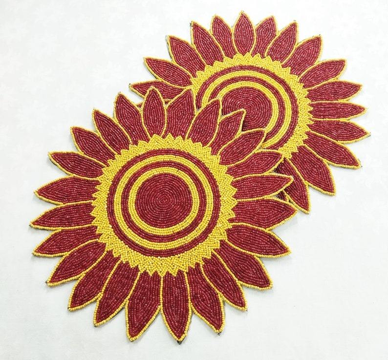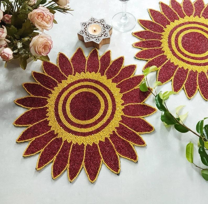 แผ่นรองจานงานแต่งงานลายเรียบหรู ประดับด้วยลูกปัดปักมือ เป็นมิตรกับสิ่งแวดล้อม ดูมีระดับ สีทอง ใช้ตกแต่งกลางโต๊ะ