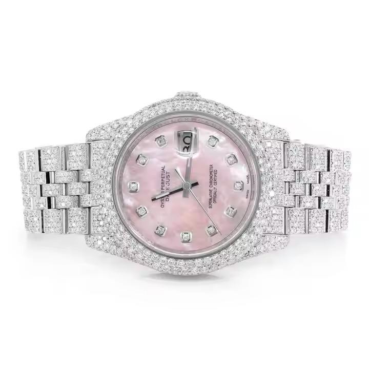 นาฬิกาเพชรโมอิสสีชมพูเต็มรูปตัวเลขหน้าปัดสีชมพูหรูหราทันสมัยทันสมัยทันสมัยเหมาะสำหรับนักธุรกิจโบราณ