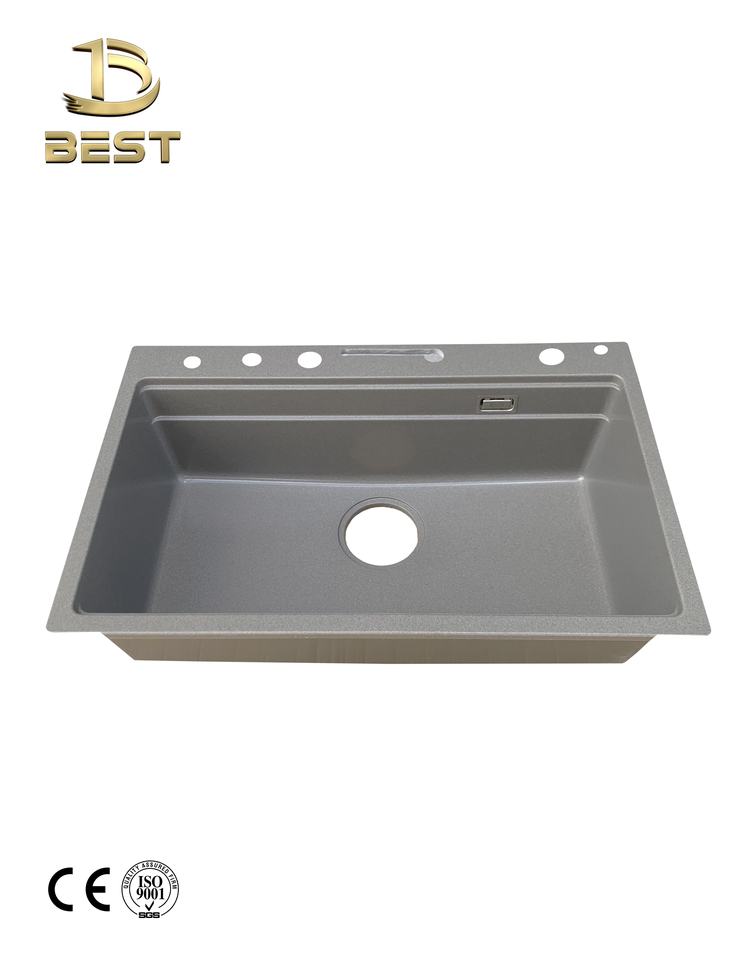อ่างล้างจานหินควอตซ์แบบเดี่ยวกันรอยขีดข่วนสีดำสุดหรูอ่างล้างจานดีไซน์สี่เหลี่ยมผืนผ้าก๊อกน้ำติดด้านบนทำจากหินแกรนิต3ปี