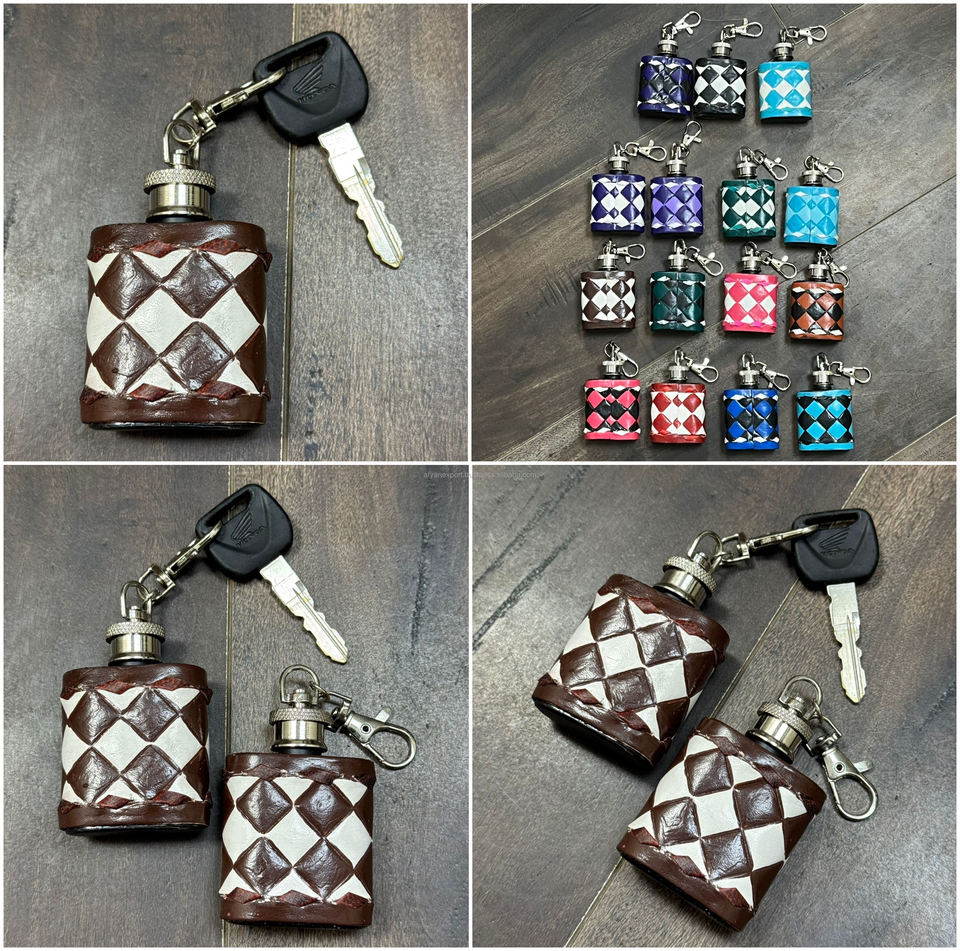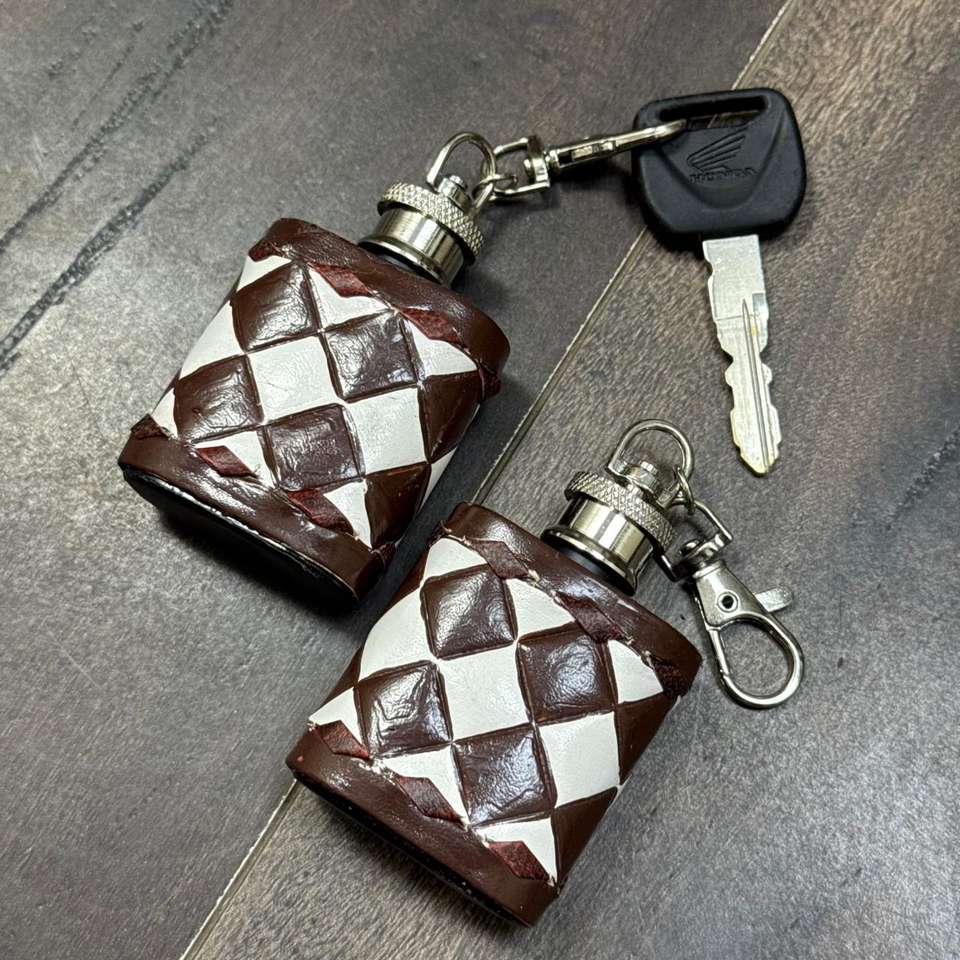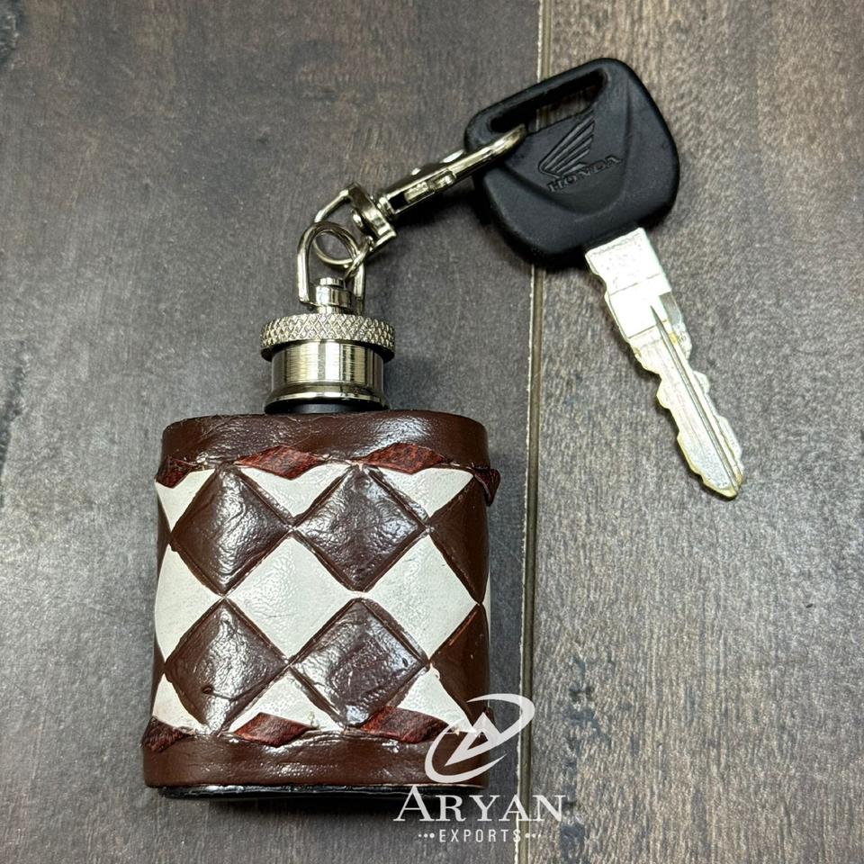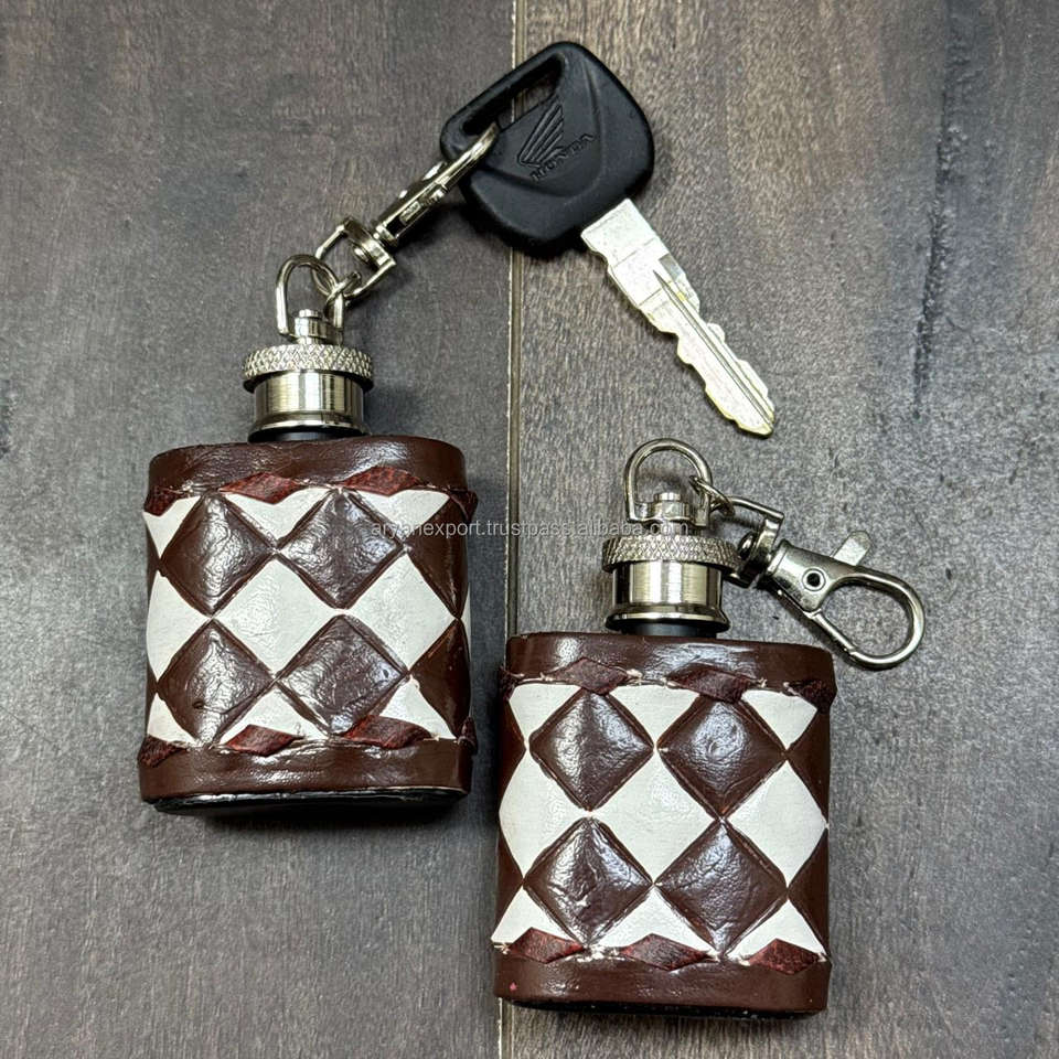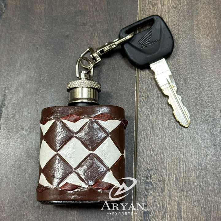 ขวดเหล้าหนังแท้ลายตาราง ทำด้วยมือ พร้อมพวงกุญแจ