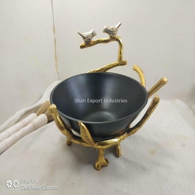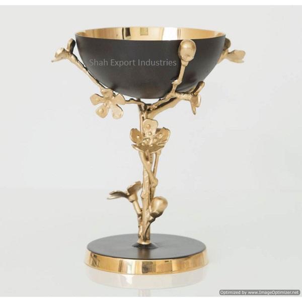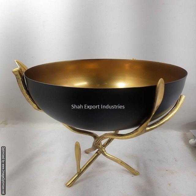 ชามอลูมิเนียมดีไซน์เนอร์ลายใบไม้ดอกไม้สีทองหรูหราสีดำพร้อมขาตั้งสำหรับตกแต่งบ้านชามเสิร์ฟแบบทันสมัย