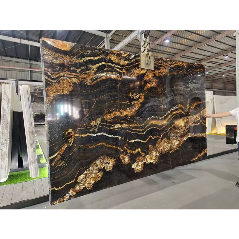 แผ่นหินแกรนิตไทเทเนียมไทเทเนียมสีดำแบบฟิวชั่นหรูหราสีดำทอรัสแมกมาพร้อมกับเส้นเลือดทอง