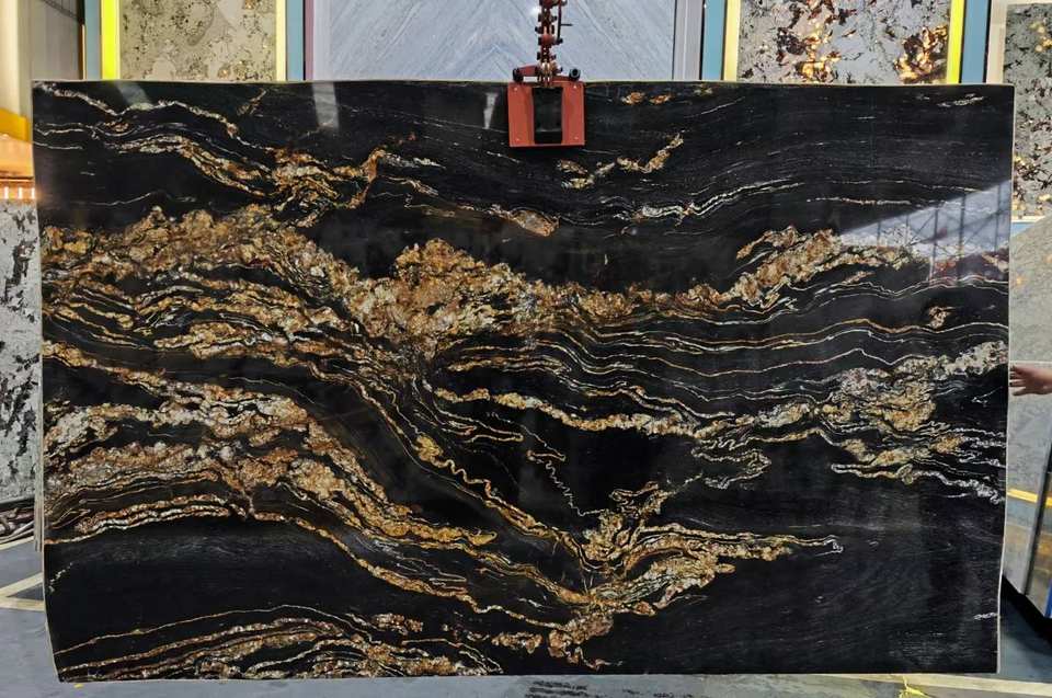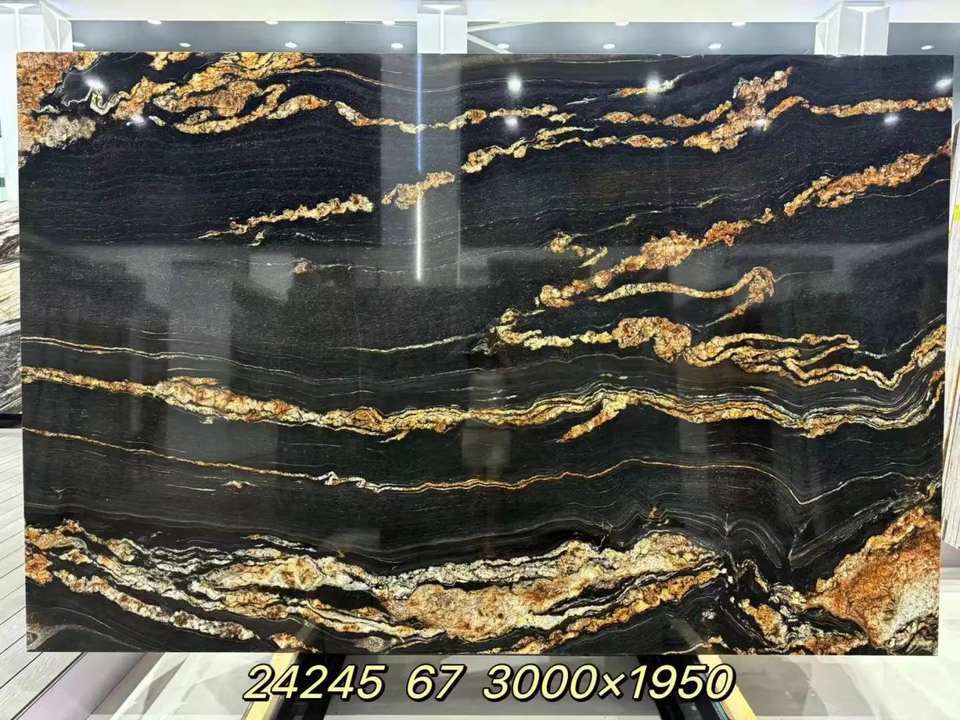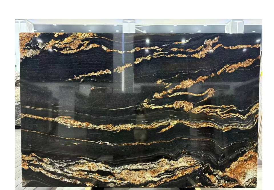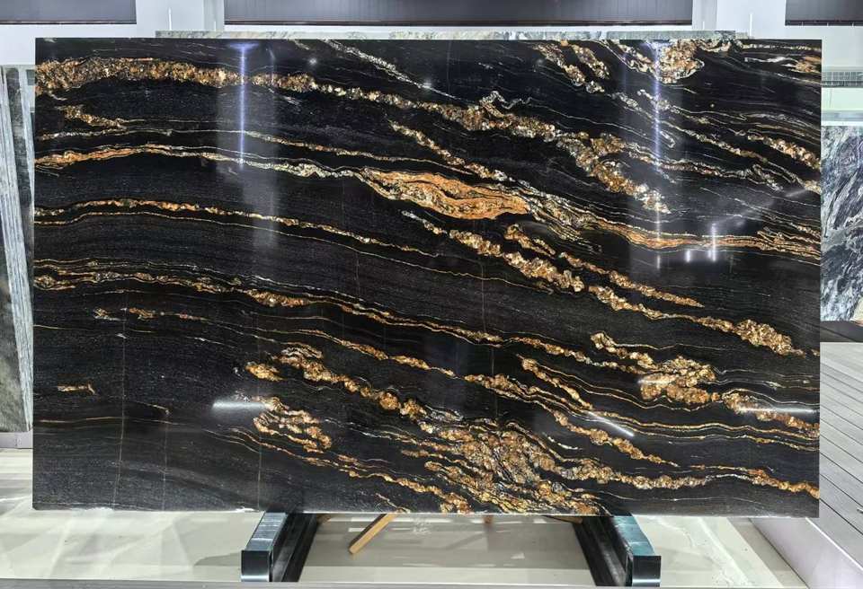 การออกแบบแผ่นหินควอตซ์หรูหราสีดำทองหรูหรากันน้ำสำหรับเคาน์เตอร์ผนังพื้นหลังในร่มกราฟิก