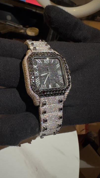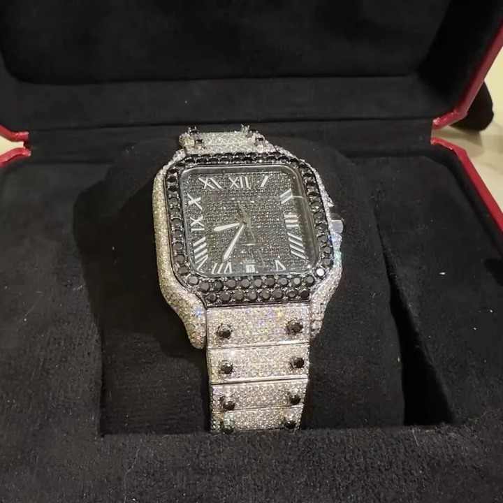 นาฬิกาข้อมือดีไซน์ฮิปฮอป สายสแตนเลสสตีลสำหรับผู้ชาย หน้าปัดทรงสี่เหลี่ยมประดับเพชรโมอิสซาไนต์ VVS สีดำหรูหรา พร้อมกลไกควอตซ์