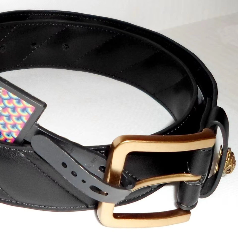 เข็มขัดหนังควิลท์พร้อมหัวเข็มขัดสีทองและตราสัญลักษณ์ดีไซน์เนอร์ทำด้วยมือแบบพรีเมี่ยม