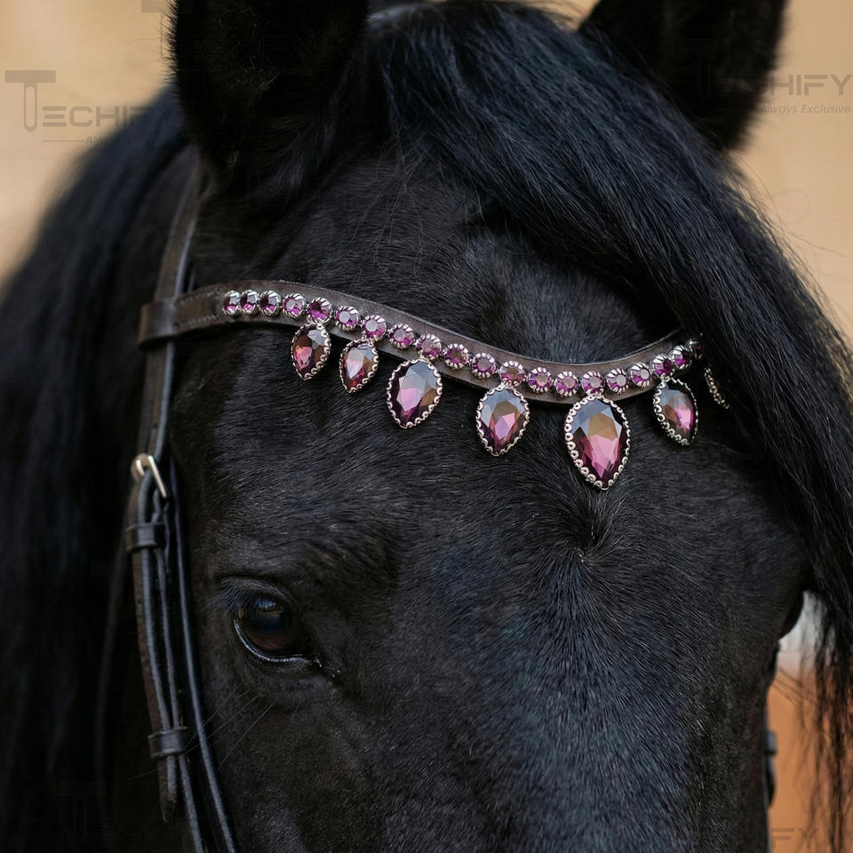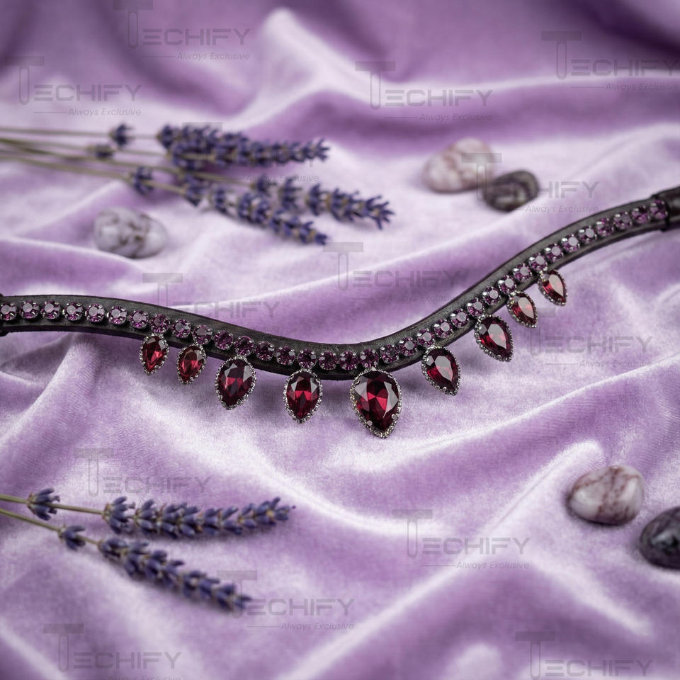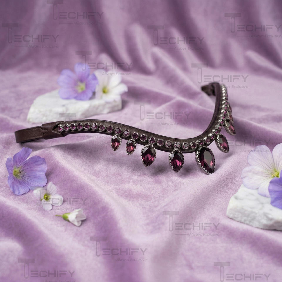 สายคาดหน้าผากม้าหนังสีดำสุดหรู ประดับคริสตัลรูปหยดน้ำสีม่วงและขอบตกแต่งด้วยเพชรเทียม