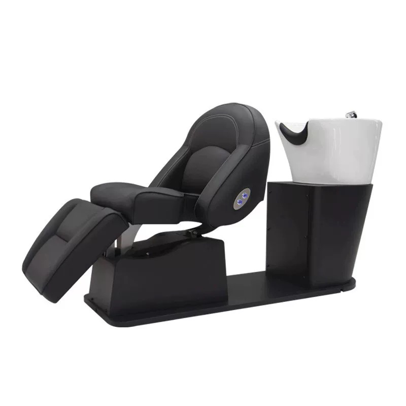 เก้าอี้แชมพูหนังสีดำสุดหรูพร้อมอ่างเซรามิกไฟฟ้าปรับได้สำหรับซัพพลายเออร์เฟอร์นิเจอร์ร้านเสริมสวย