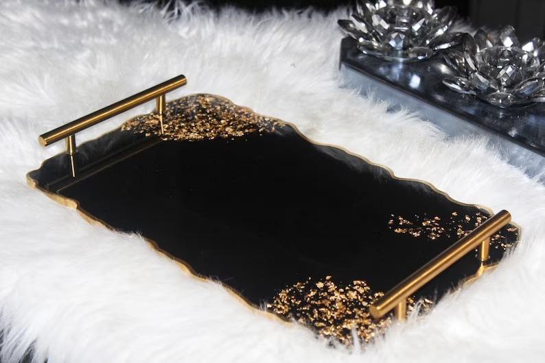 ถาดเสิร์ฟเรซิ่นสีดำสุดหรู ถาดเรซิ่นอีพ็อกซี่กลิตเตอร์สีทอง สำหรับบ้านและห้องครัว ราคาถูกจากอินเดีย