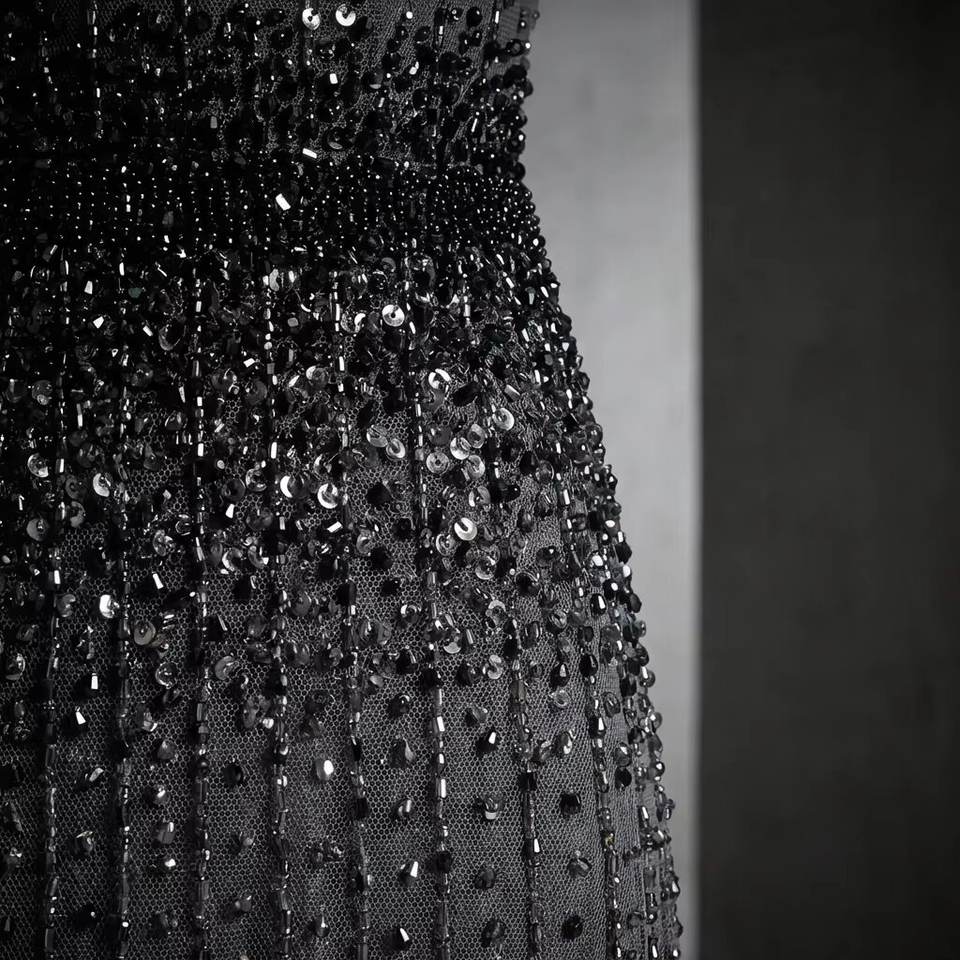 ชุดราตรีหรูหราสีดำแบบไร้สายรัดไหล่ ประดับด้วยลูกปัดทำมือ ยาวกรอมพื้น ตกแต่งคริสตัล ชุดเดรสออกงานขายส่งจำนวนมาก