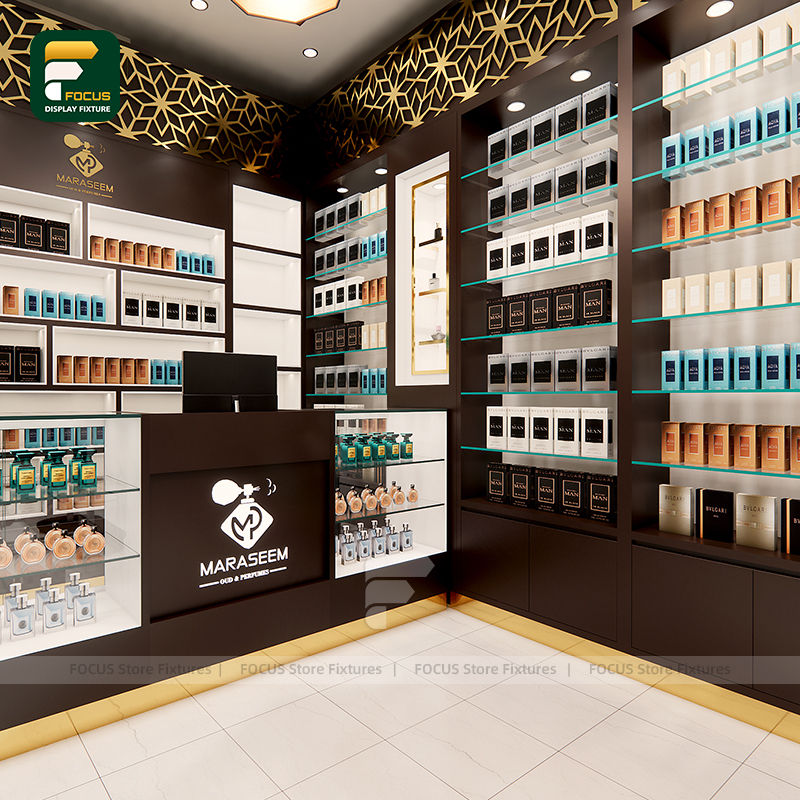 ตู้โชว์น้ำหอมสีขาวสีดำสุดหรูตู้โชว์น้ำหอมติดผนังชั้นวางของน้ำหอมออกแบบสำหรับร้านค้าปลีก