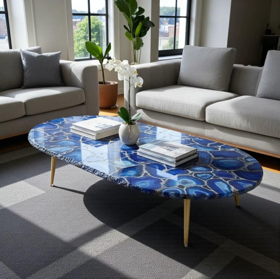 โต๊ะอาหารหินอาเกตสีน้ำเงินสุดหรู งานฝีมือจากแผ่นหินอัญมณี โต๊ะอาหารดีไซน์โดดเด่น ท็อปโต๊ะอาหารหินอัญมณีอาเกตสีน้ำเงิน