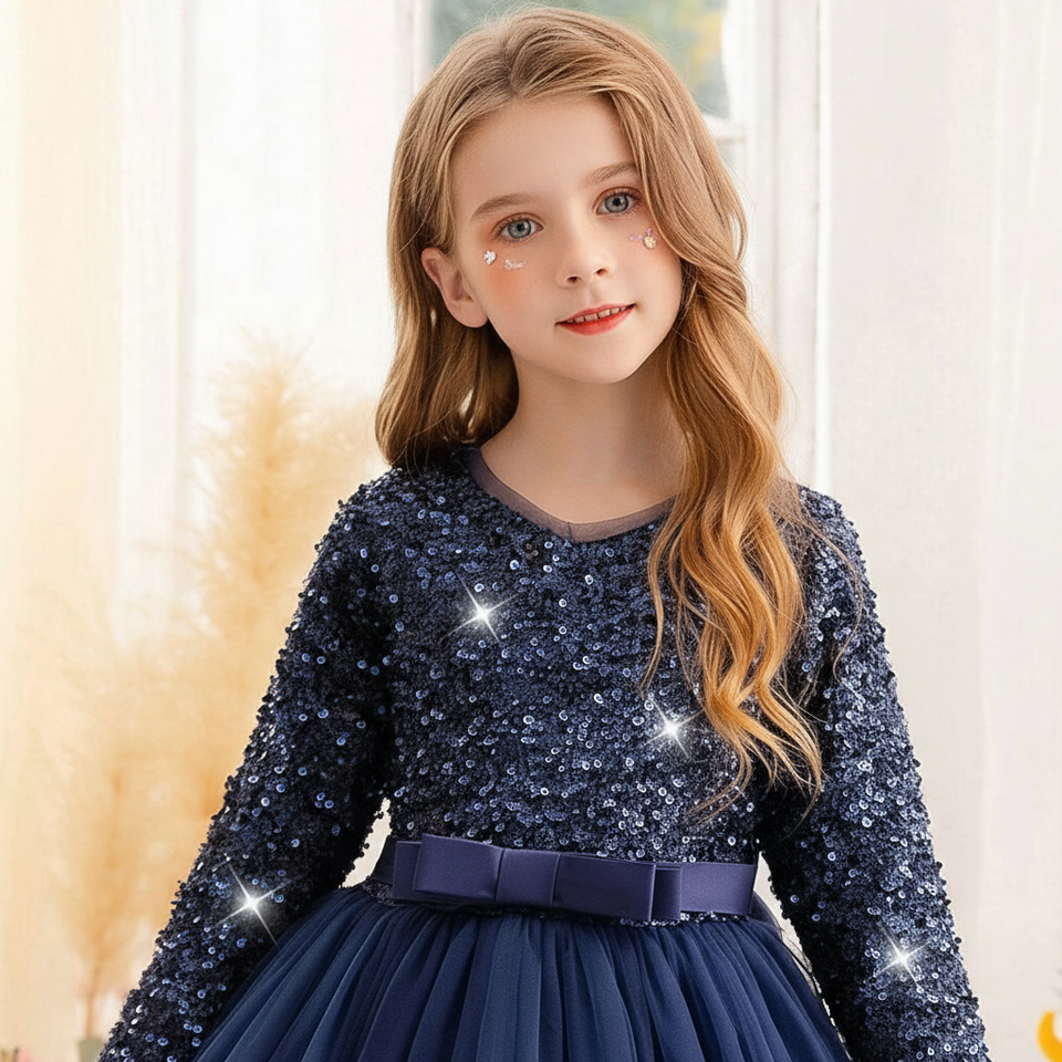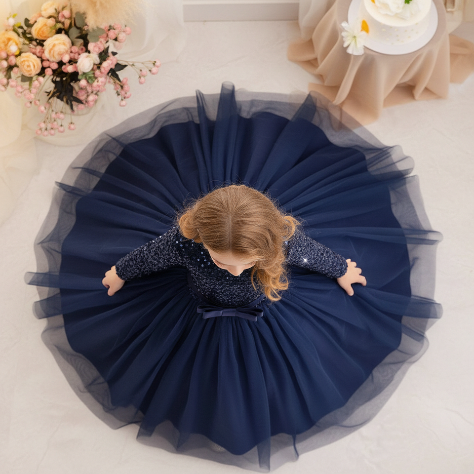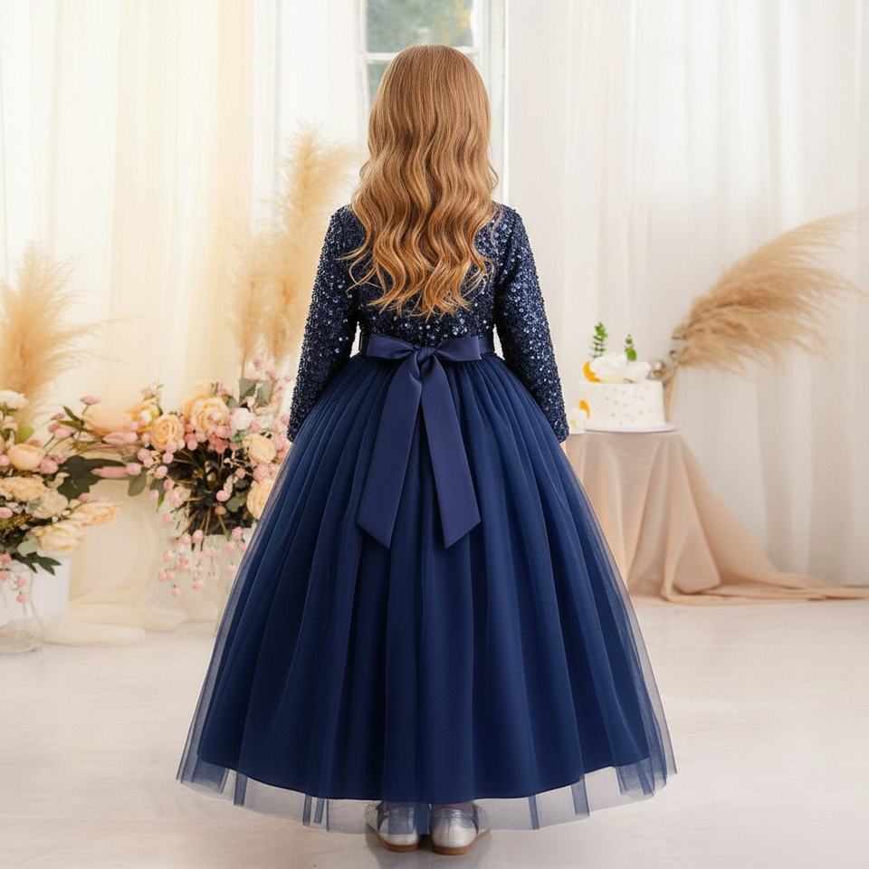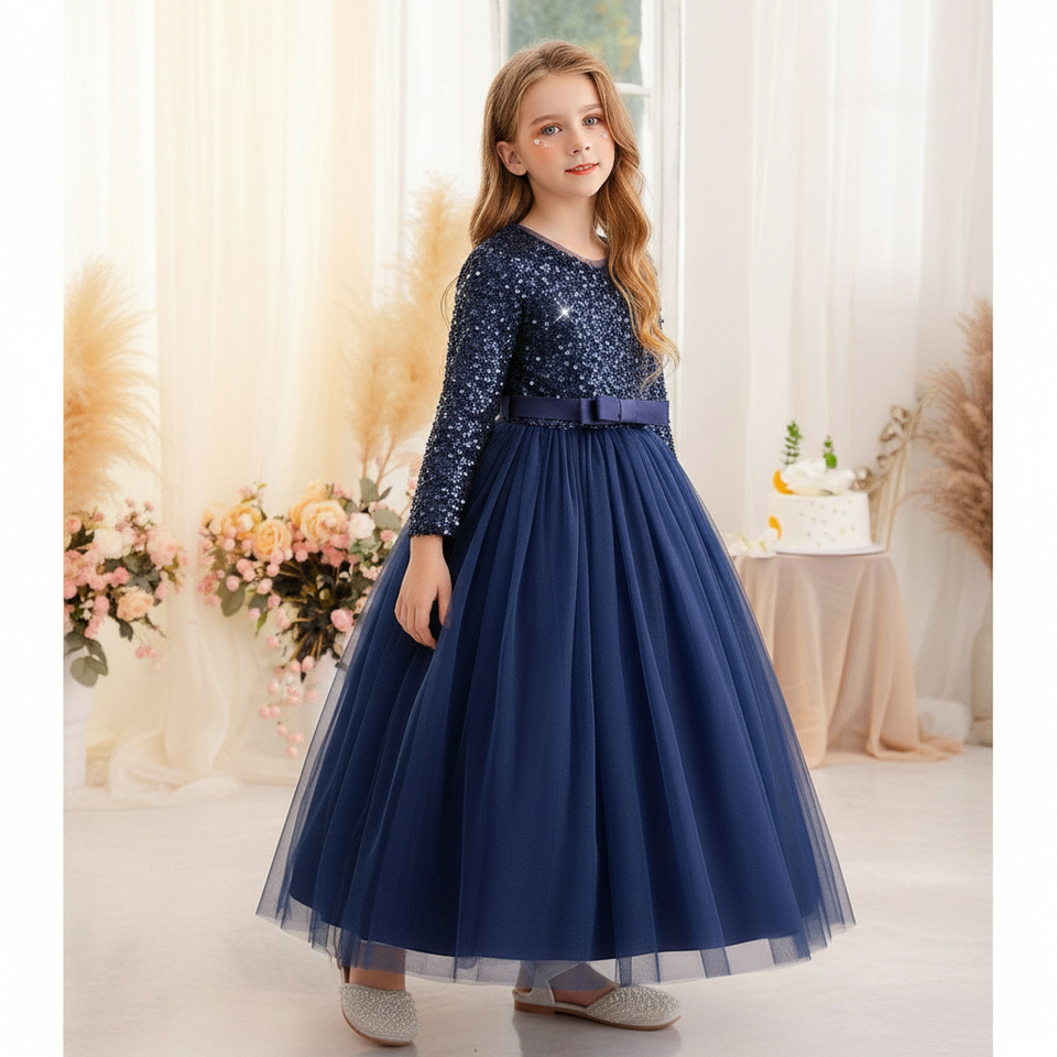 ชุดราตรีเด็กผู้หญิง แขนยาว คอวี ผ้ากำมะหยี่สีน้ำเงินหรูหรา ปักเลื่อม ประดับด้วยผ้าเน็ตเนื้อนุ่ม สไตล์เจ้าหญิง สำหรับงานเลี้ยงตอนเย็น รับผลิตแบบ OEM ODM จำนวนมาก