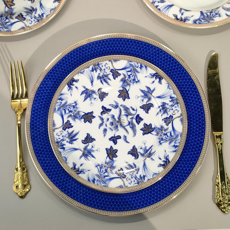 ชุดจานพอร์ซเลนสีฟ้าขาวสุดหรูชุดเครื่องใช้สำหรับอาหารค่ำเซรามิกชั้นดีสำหรับงานแต่งงานบ้านกาแฟร้านอาหารสไตล์ตะวันตกสุดคลาสสิก