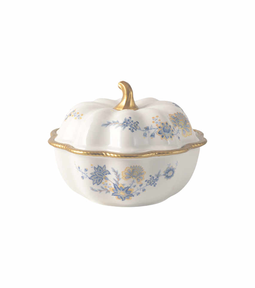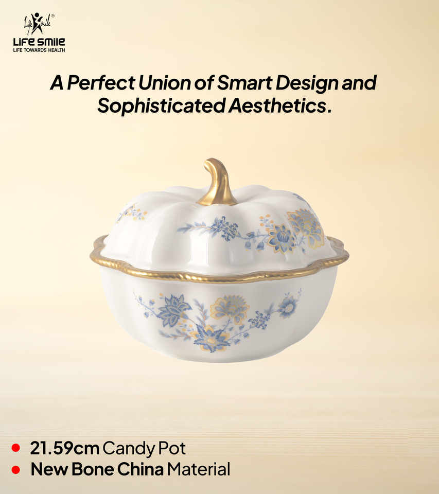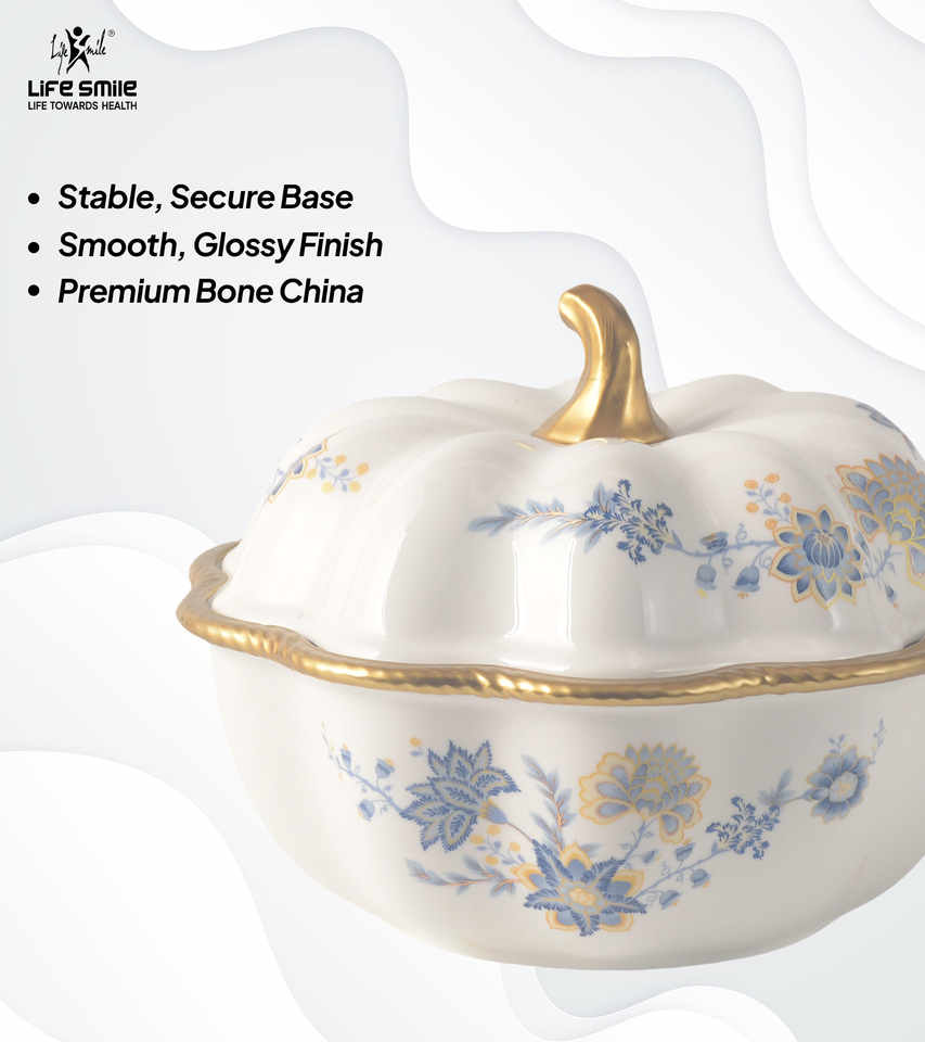 ชามขนมหรูหราทำจากกระเบื้องโบนไชน่า ลายดอกไม้ ประดับด้วยทองคำ พร้อมฝาปิดหูจับสีทองสุดหรู