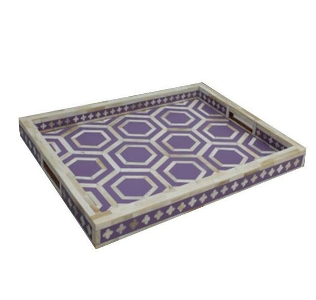 ถาดเสิร์ฟแบบฝังกระดูกแบบเรขาคณิตสีม่วงและสีขาวถาดเรซิ่นออตโตมันสำหรับเป็นของขวัญในครัวเรือน