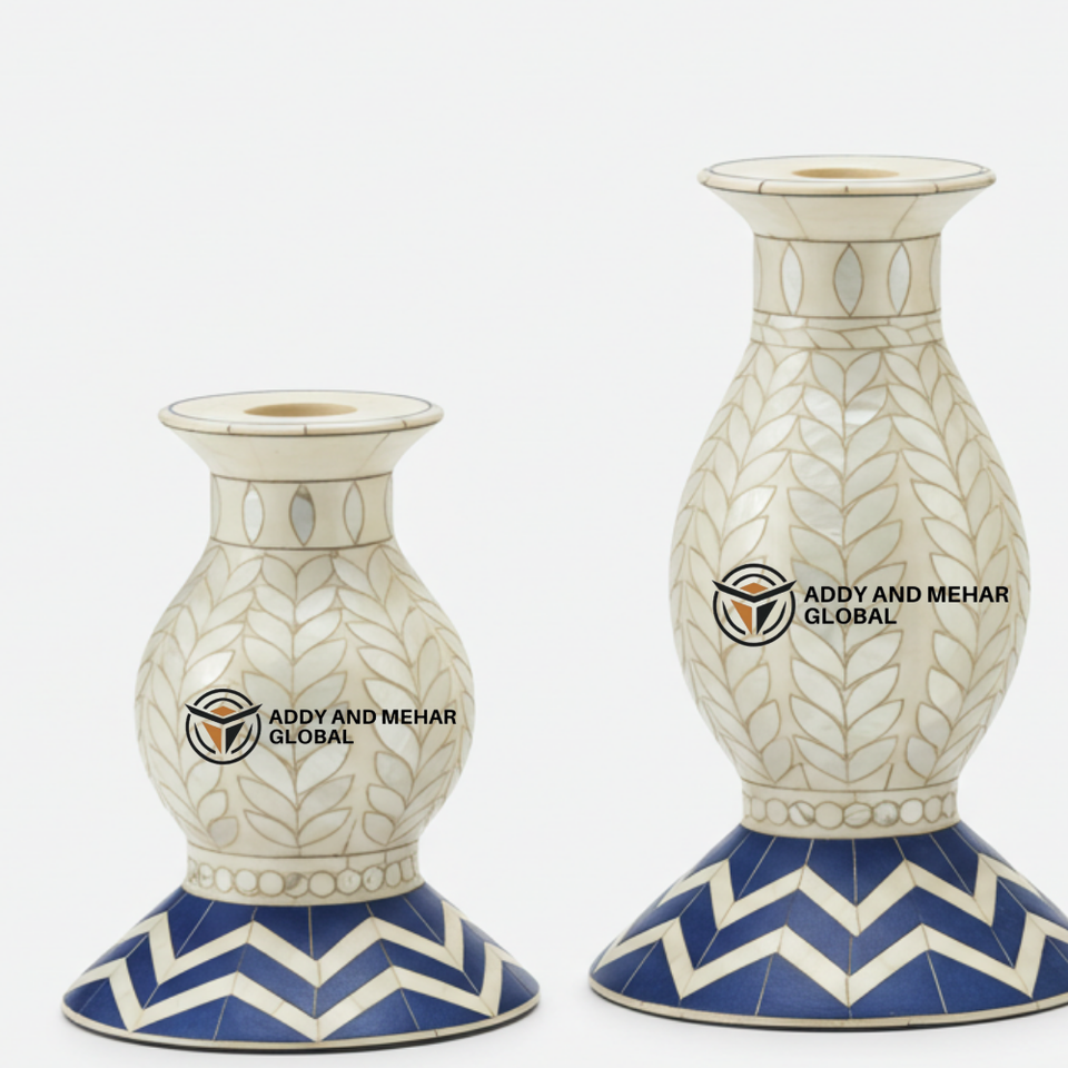 เชิงเทียนทรงเรียวฝังลายกระดูกหรูหรา สีน้ำเงินและสีขาว ฐานลายเรขาคณิต ลวดลายดอกไม้/ใบไม้ ขายส่งของตกแต่งบ้านและอุปกรณ์จัดงาน