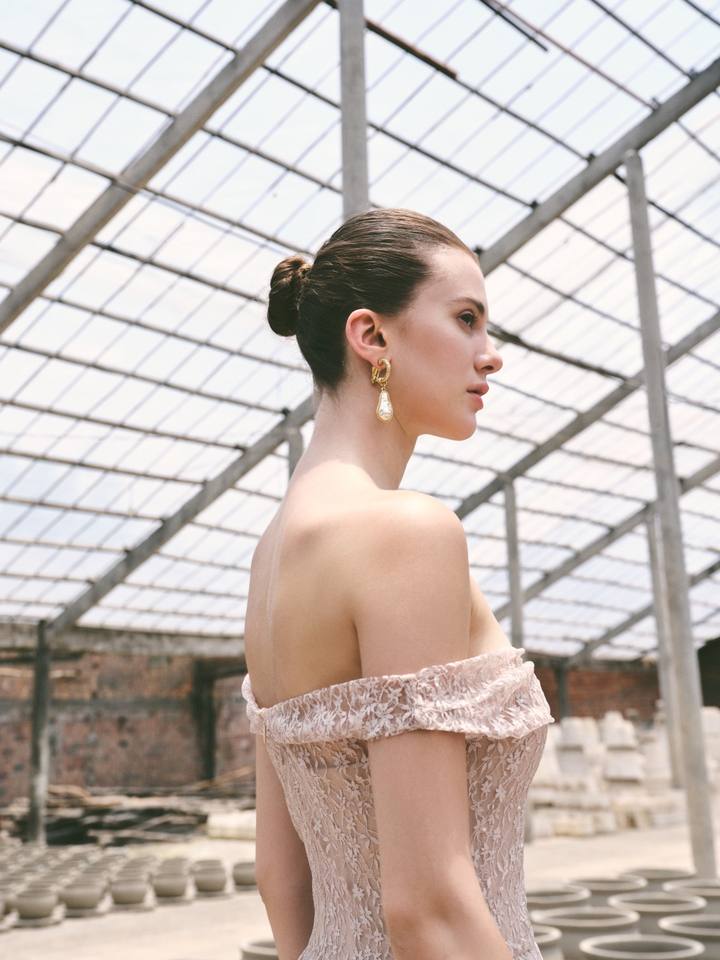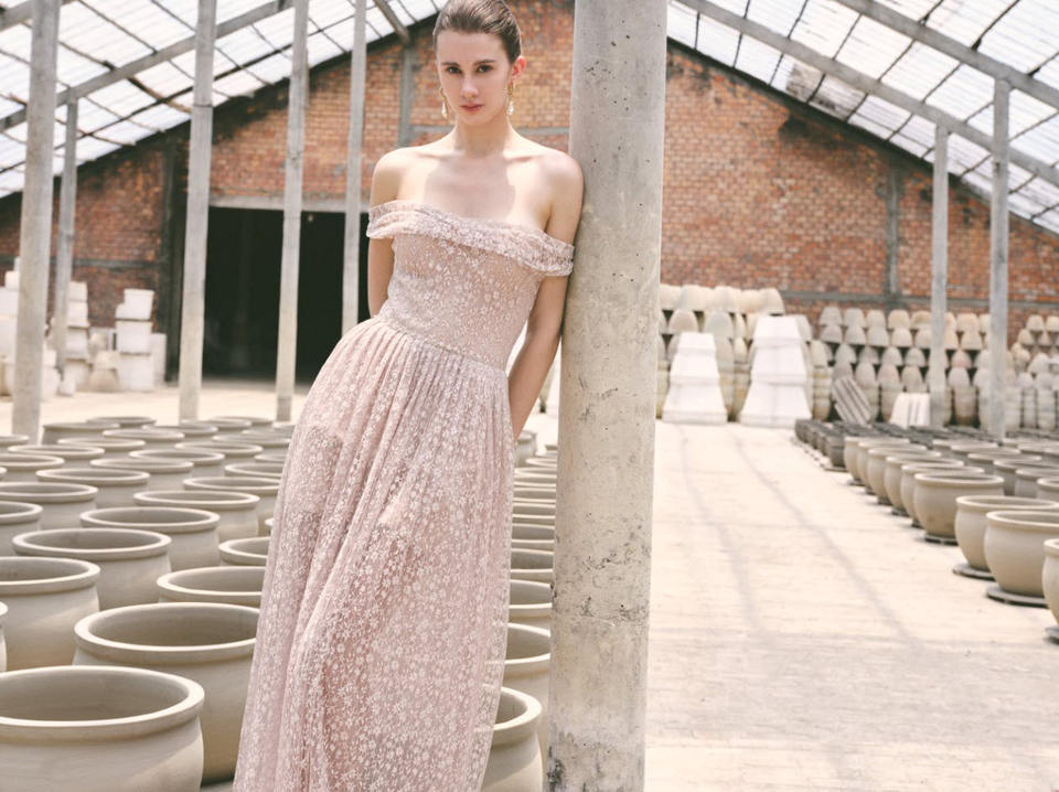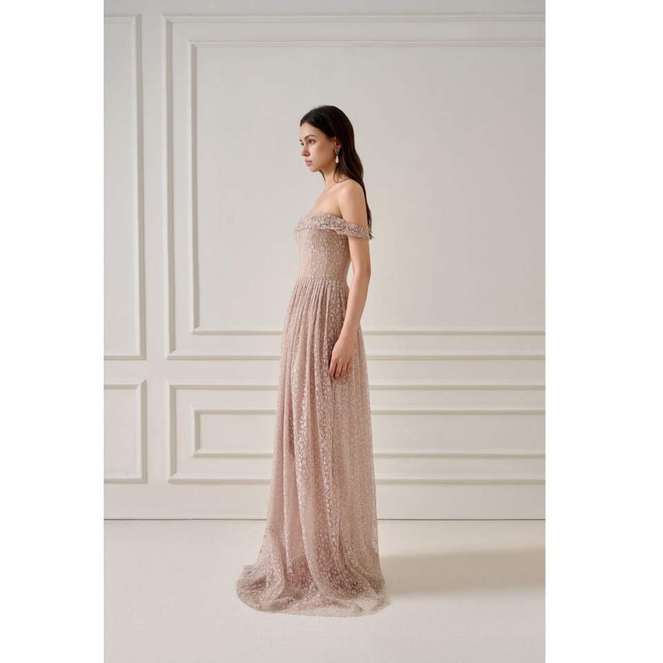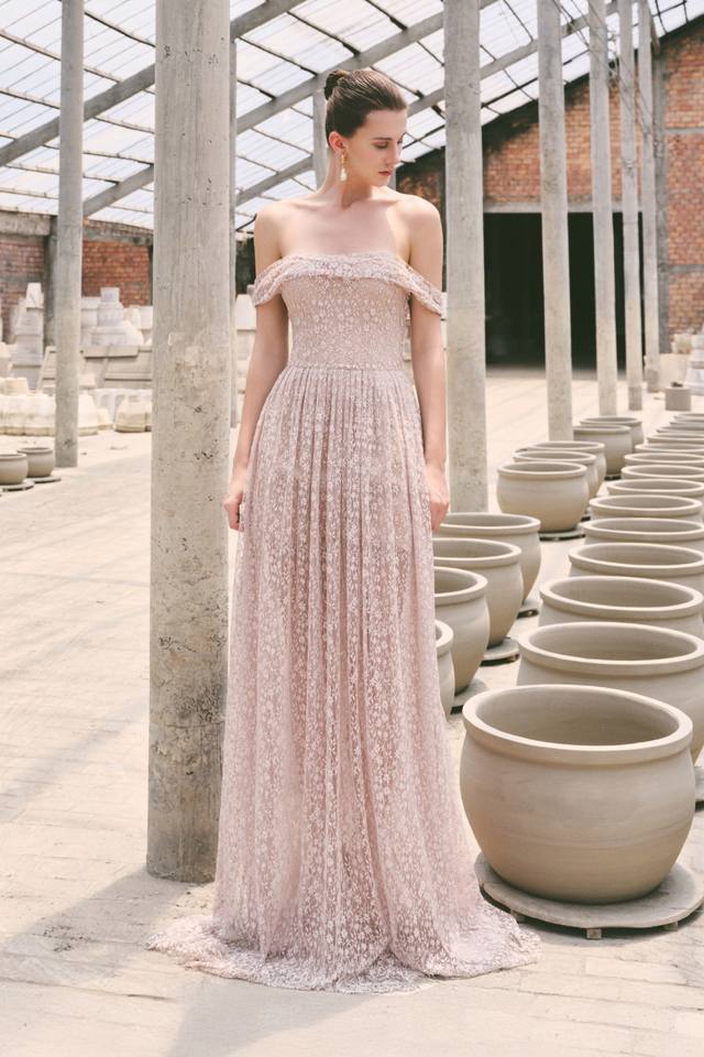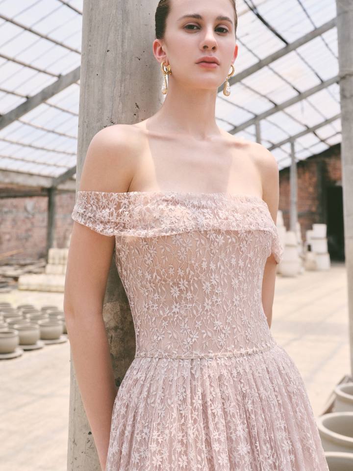 ชุดเดรสของผู้หญิงหรูหราแบรนด์หรูชุดเดรสแต่งระบายผ้าตาข่ายแบบเปิดไหล่เสื้อผ้าแฟชั่นของผู้หญิง