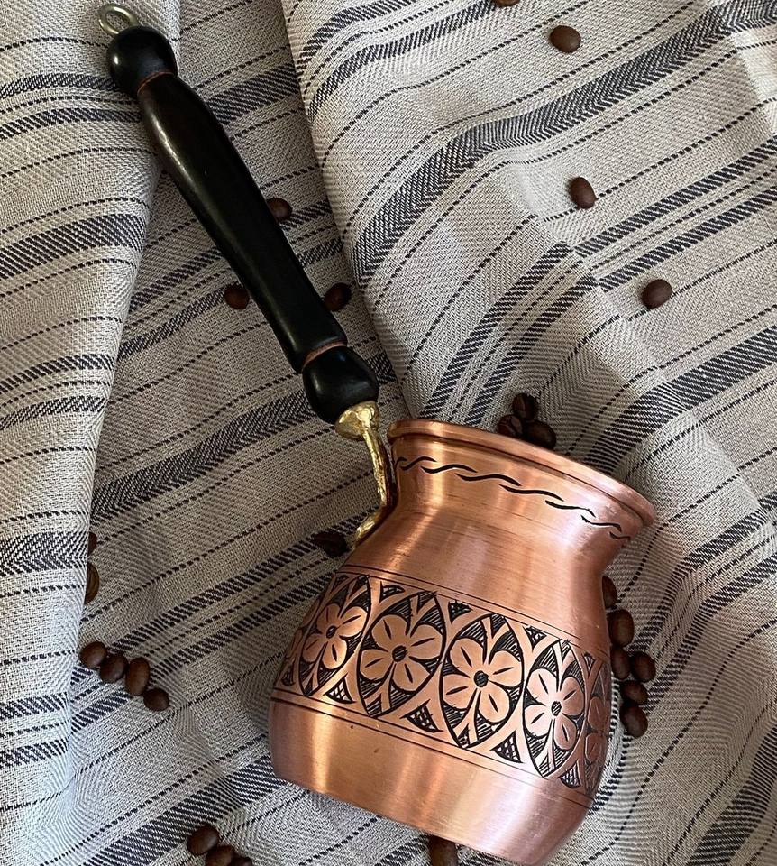 หม้อกาแฟทองเหลืองหรูหราพร้อมด้ามจับไม้และลวดลายเคลือบสีสันสดใส สำหรับชงกาแฟแบบตุรกี อาหรับ กรีก ใช้สำหรับตกแต่ง