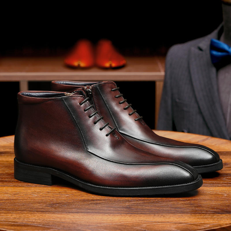 รองเท้าบูทหนังแกะสีน้ำตาลสุดหรูแบบสวมยาวเหนือเข่า พร้อมพื้นผิวกันน้ำและซับในกันความหนาวเย็น เหมาะสำหรับสภาพอากาศหนาวและโอกาสที่เป็นทางการ