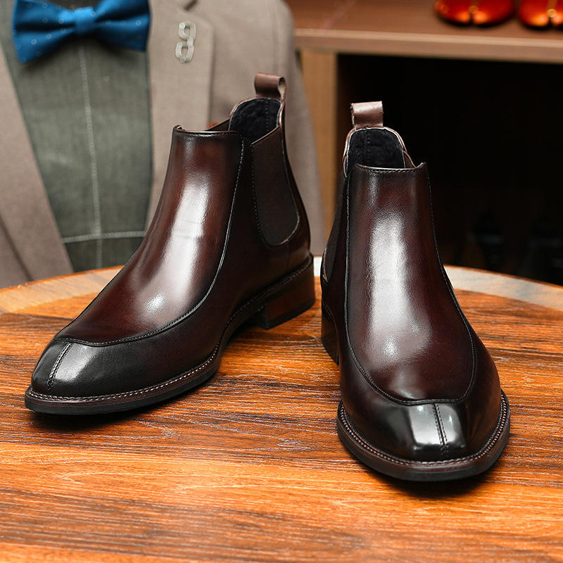 รองเท้าบูทหนังแกะสีน้ำตาลสุดหรูแบบสวมยาวเหนือเข่า พร้อมพื้นผิวกันน้ำและซับในกันความหนาวเย็น เหมาะสำหรับสภาพอากาศหนาวและโอกาสที่เป็นทางการ