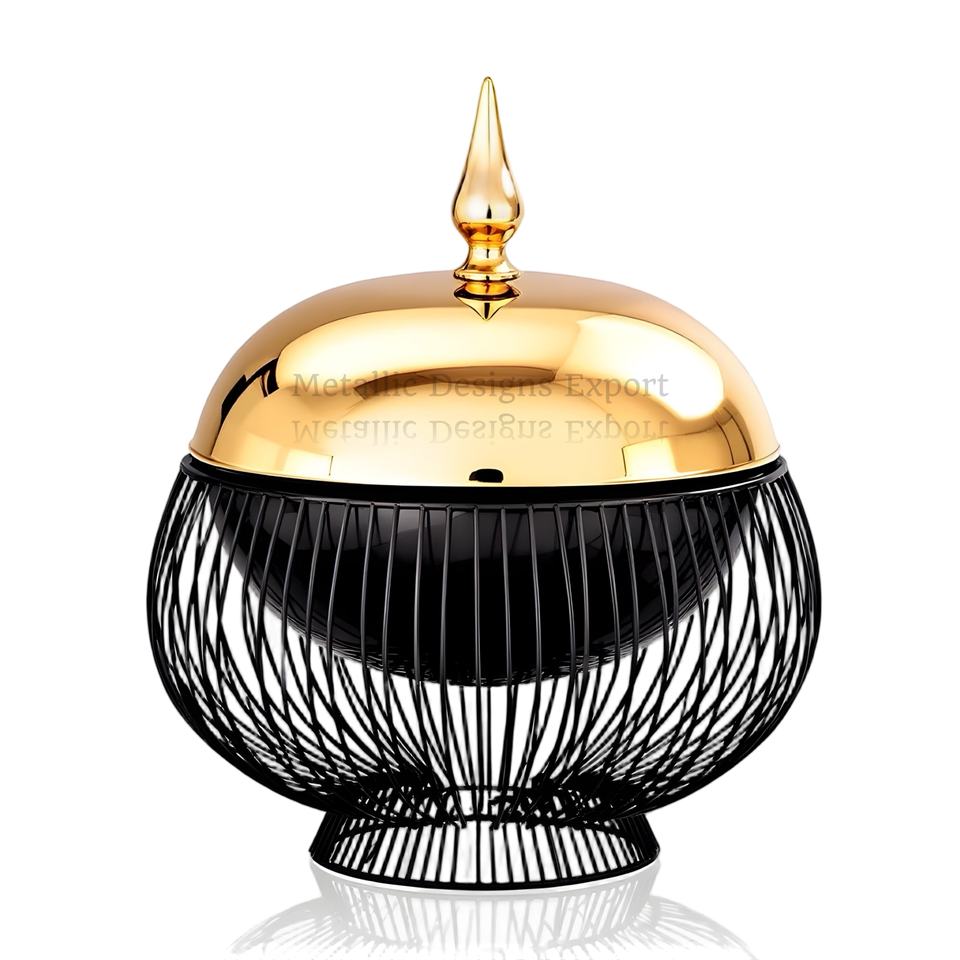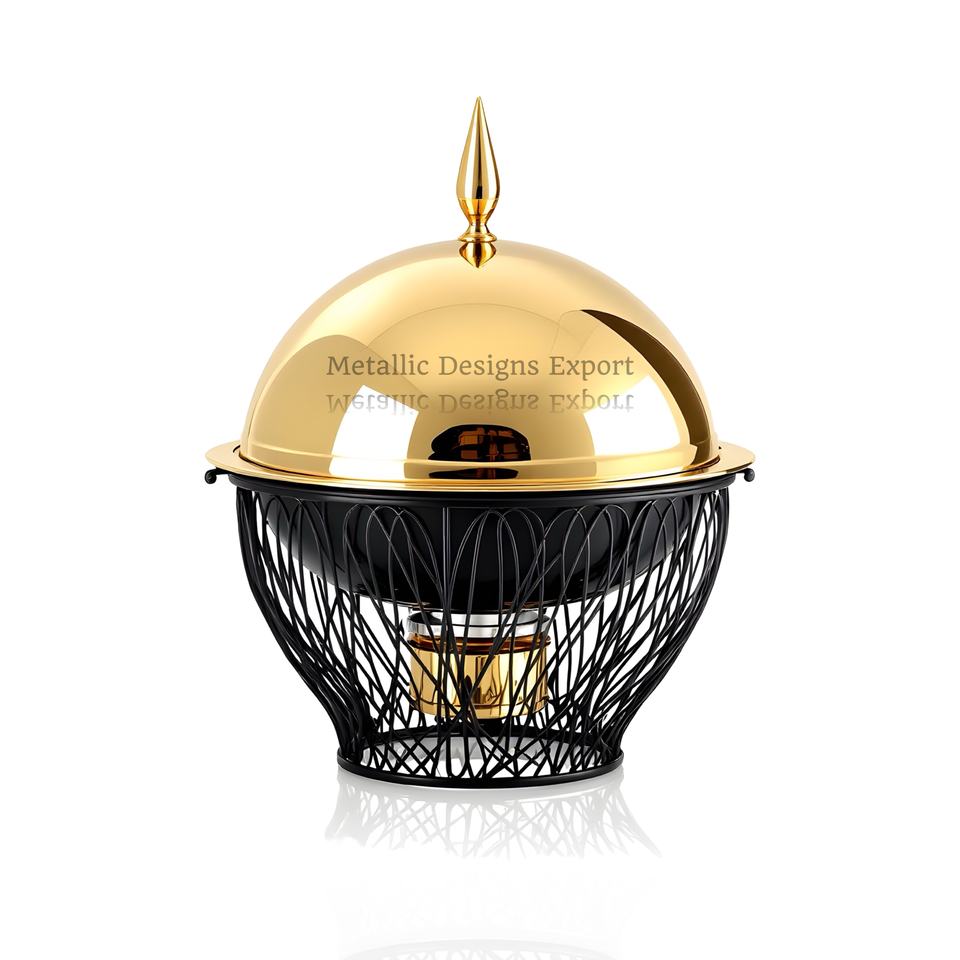 ชามใส่อาหารทรงกลมสีดำและสีทองพร้อมขาตั้งสำหรับบุฟเฟ่ต์สุดหรูสำหรับการนำเสนออาหารในงานแต่งงานและงานเลี้ยง