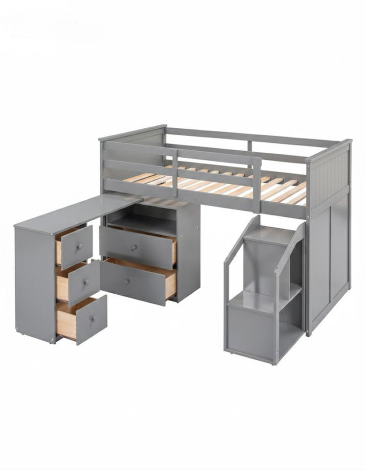 เตียงสองชั้นหรูหราขนาดทวิน ปรับระดับได้ พร้อมที่เก็บของ บันได และโต๊ะเขียนหนังสือ สำหรับห้องนอนเด็ก