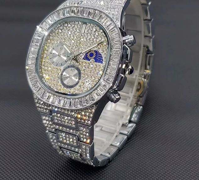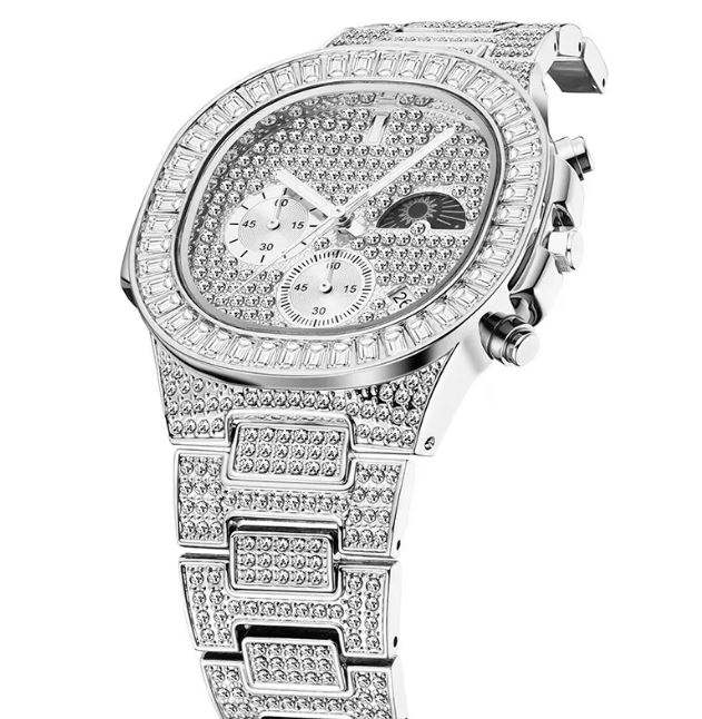 นาฬิกาข้อมือผู้ชายสุดหรู สไตล์ฮิปฮอป ดีไซน์ Moon Bling ประดับเพชร VVS สีเงิน สายหนังอิตาลี ระบบควอตซ์ Ronda หนา 5 มม.