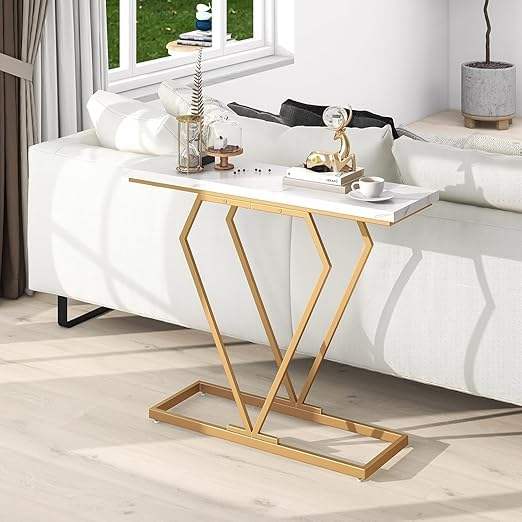 โต๊ะข้างโซฟาทรงตัวซีสุดหรูพร้อมท็อปสีขาวและโครงโลหะสีทอง