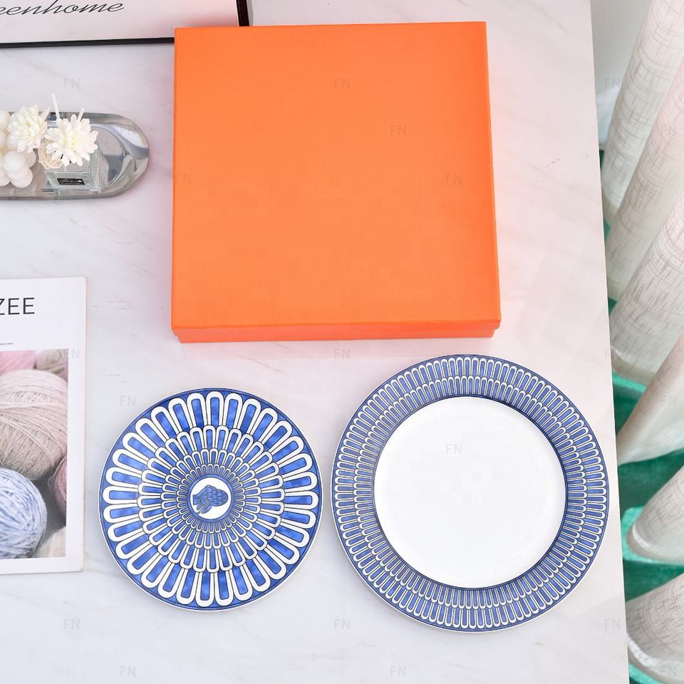 จานเซรามิกหรูหรา ขนาด 10/8.5 นิ้ว ชุดจานอาหารค่ำ คุณภาพสูง ทำจากโบนไชน่า สไตล์มินิมอล สีน้ำเงินรอยัล ราคาประหยัด ขนาด 10.5 นิ้ว