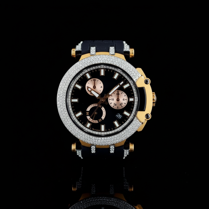 นาฬิกาสปอร์ตประดับเพชรโครโนกราฟสุดหรูสีดำและสีทองสำหรับผู้ชายนาฬิกาแข่งรถสีทอง18K