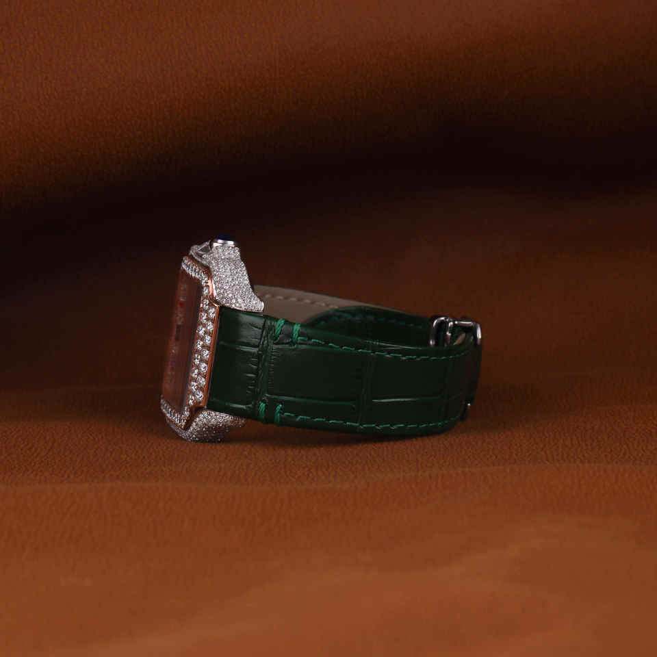 นาฬิกาหรูหราคลาสสิก รุ่นควอตซ์ กระจกคริสตัล ประดับเพชรโมอิสซาไนต์ทรงเหลี่ยม สายหนังสีเขียวแบบครึ่งไอซ์ ตัวเรือนหลากสี ตัวเลขโรมัน สายขนาด 20 มม.