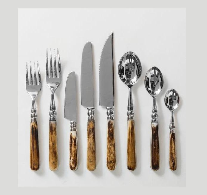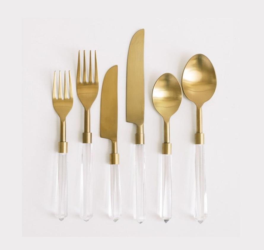 ชุดช้อนส้อมมีดีไซน์คลาสสิกหรูหราทำจากสแตนเลสสตีลเคลือบทองเหมาะสำหรับรับประทานอาหารในร้านอาหารและโต๊ะที่หรูหรา