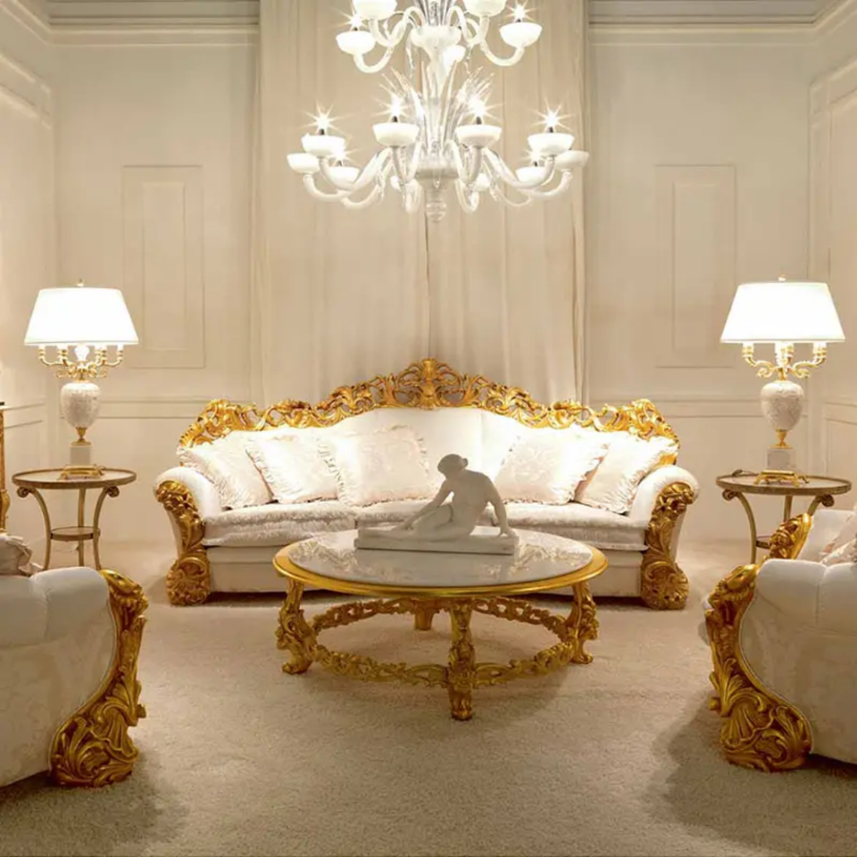 ชุดโซฟาไม้สักคลาสสิกสุดหรู สไตล์ยุโรปแกะสลักอย่างประณีต หุ้มเบาะอย่างดี เหมาะสำหรับห้องนั่งเล่นในอพาร์ตเมนต์และวิลล่า