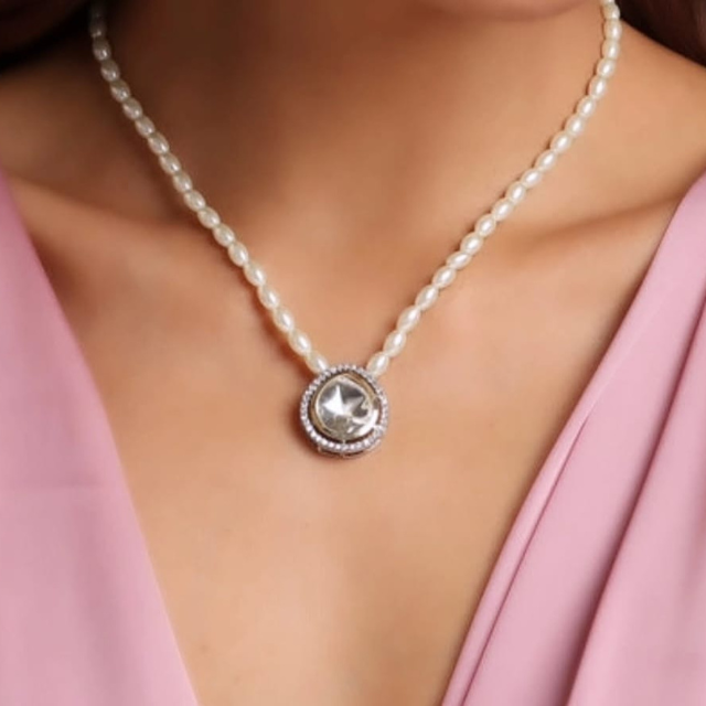 สร้อยคอทองเหลืองประดับมุกขาวคลาสสิกสุดหรู พร้อมจี้คริสตัลทรงกลมสไตล์เพชร ดีไซน์สง่างาม เหมาะสำหรับงานปาร์ตี้ สำหรับผู้หญิง
