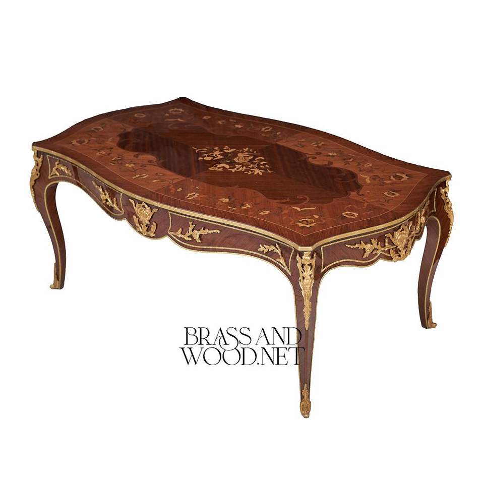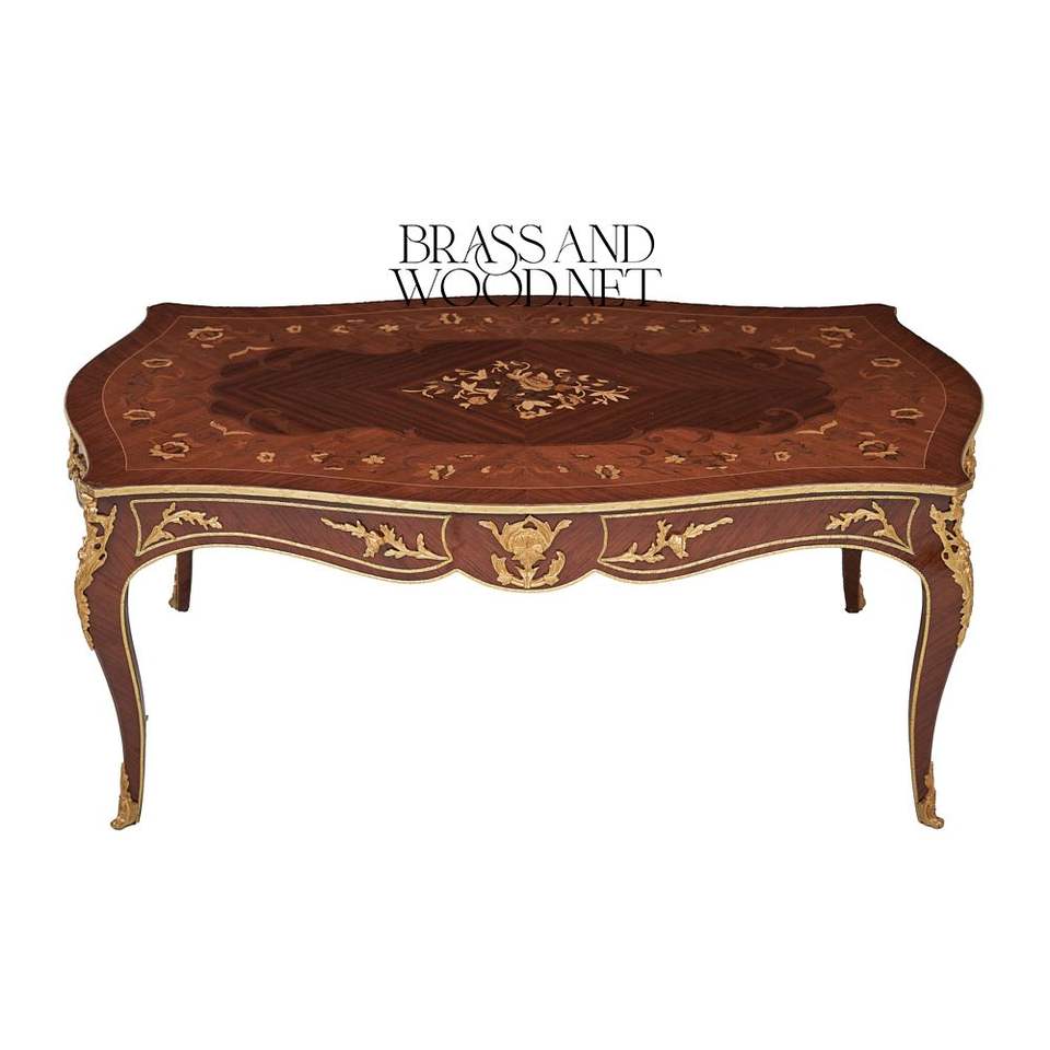 โต๊ะกาแฟสุดหรูพร้อมลายไม้ฝังทำมือและรายละเอียดทองเหลืองสุดหรูสำหรับการตกแต่งห้องนั่งเล่นสไตล์คลาสสิก