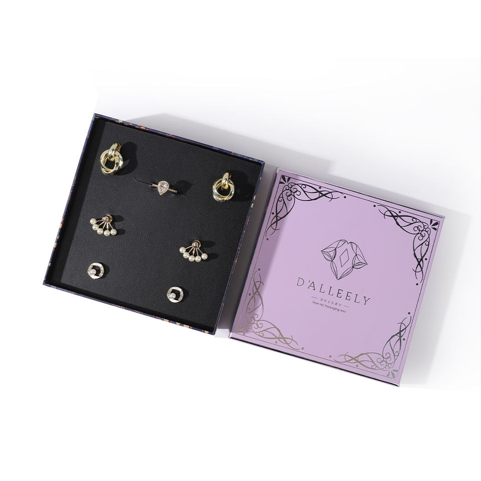 กล่องใส่เครื่องประดับสี่เหลี่ยมแข็งแรง ทำจากกระดาษแข็งสีหรูหรา เคลือบเงาและด้าน พร้อมฝาปิดแบบมีฟองน้ำและฐานบุผ้ากำมะหยี่