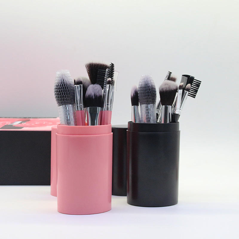 ชุดแปรงแต่งหน้าสีชมพูสีดำ12ชิ้นพร้อมถังเครื่องมือเครื่องสำอางออกแบบโลโก้ได้ตามต้องการ