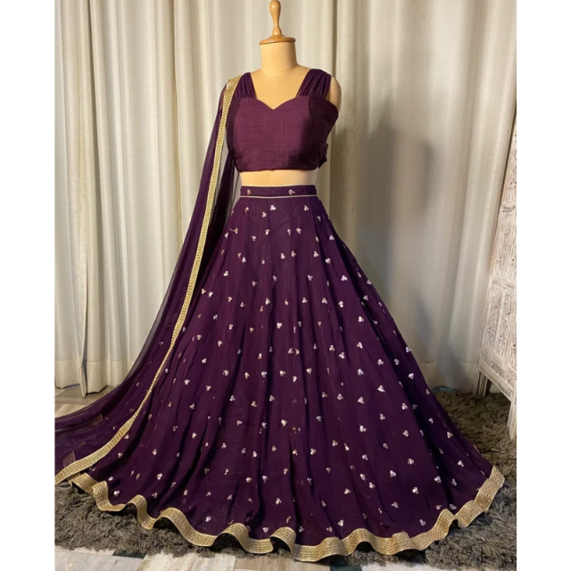 ชุดเลเฮนกาผ้าฝ้ายหรูหราสีม่วงไวน์ พร้อมขอบสีทอง ชุดเจ้าสาวและชุดแต่งงานแบบดั้งเดิม ชานียา โจลี