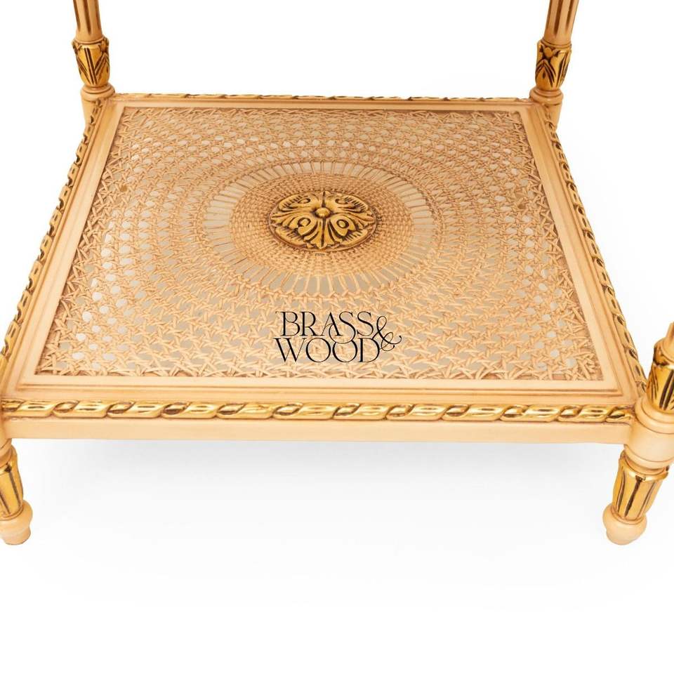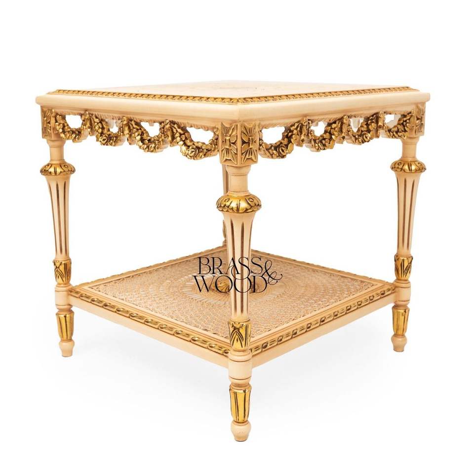 โต๊ะข้างทรงสี่เหลี่ยมหรูหราพร้อมลายวาดมือรูปดอกไม้และชั้นวางของหวายสองชั้นตกแต่งด้วยสีทองสำหรับการตกแต่งแบบคลาสสิก